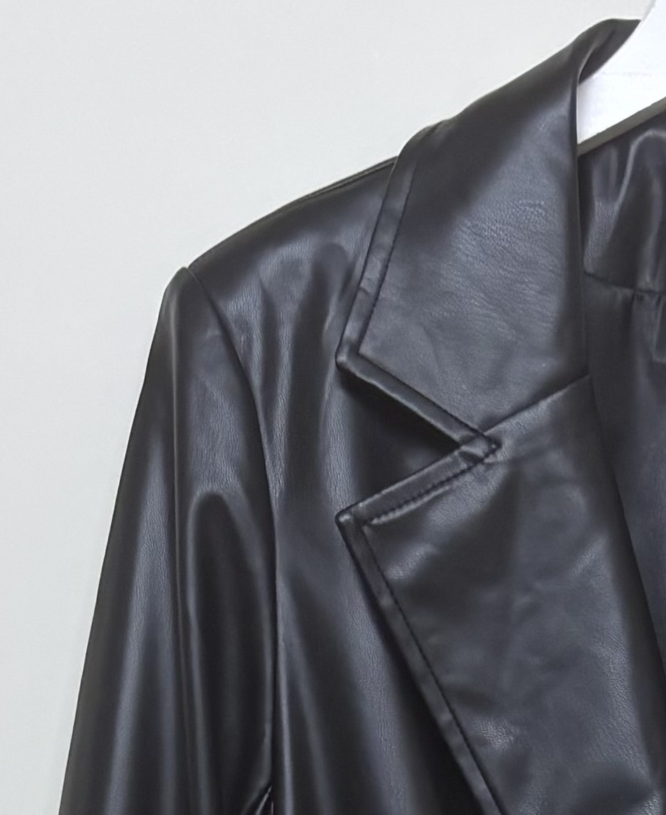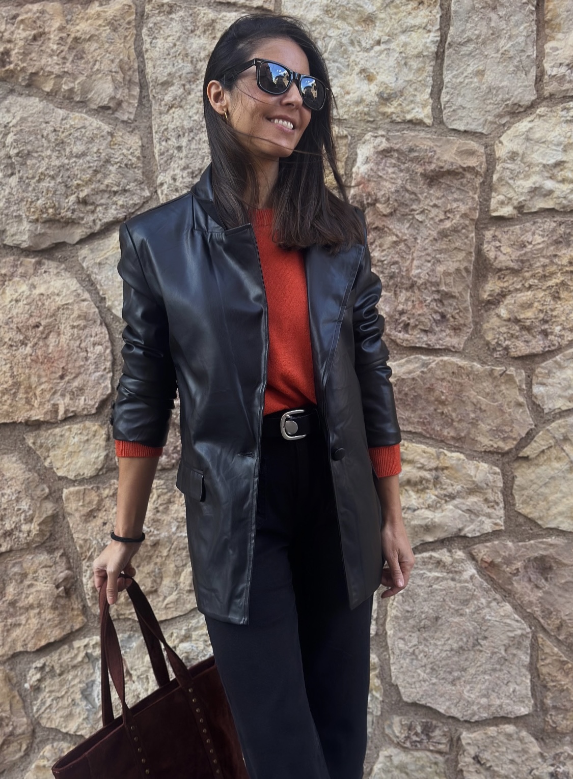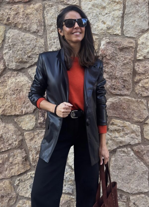 Americana entallada de ecopiel en color negro. Una prenda atemporal que resulta ser muy tendencia esta temporada. Su corte entallado y tejido elástico la hace de lo más cómoda y te permite lucirla en looks más casual como más arreglados.