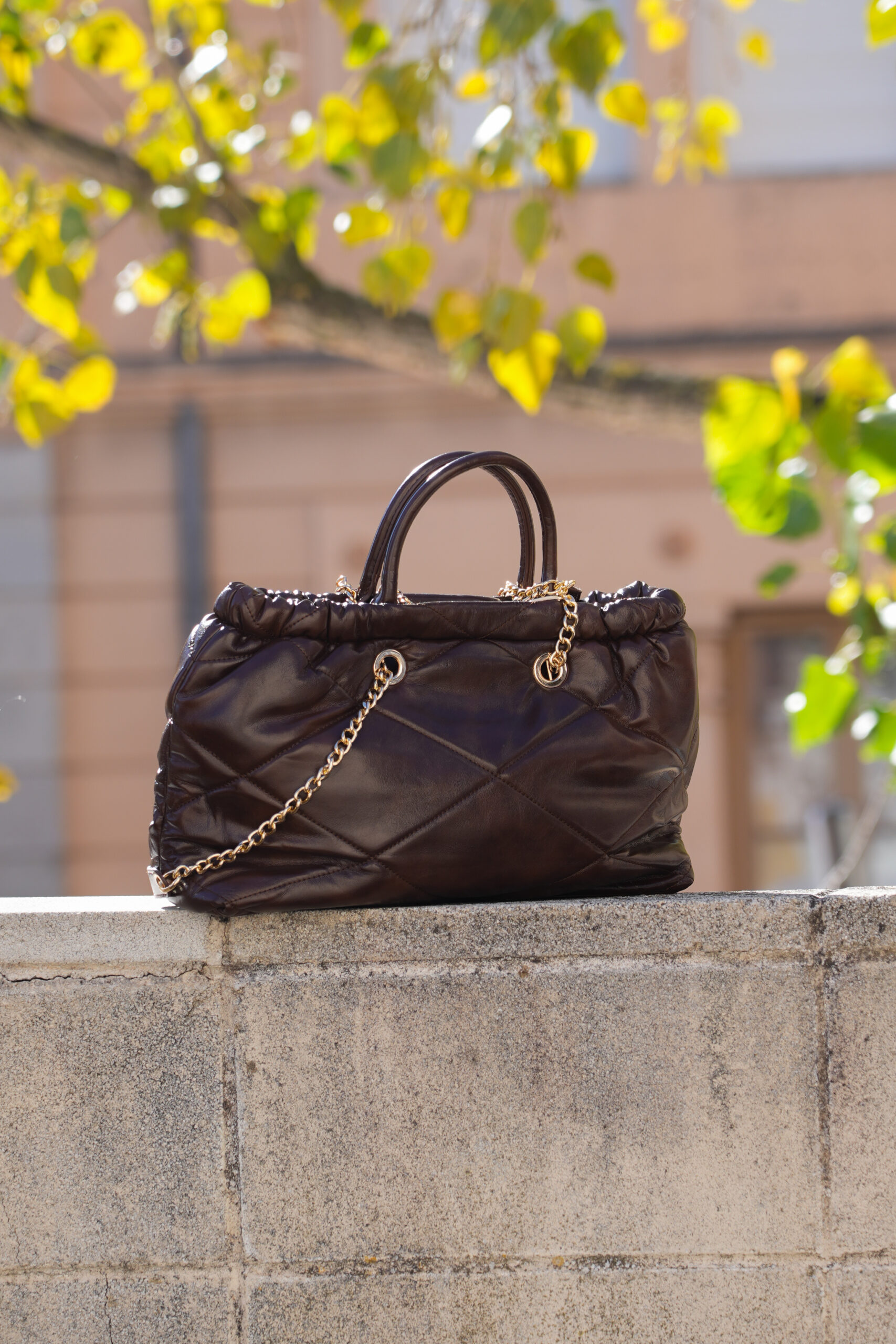 Bolso en tendencia y muy estiloso. Tejido acolchado en color marrón chocolate ligeramente brillante, cierre con cremallera y asas en cadena para llevar al hombro o mano. Un complemento que elevará tus outfits.
