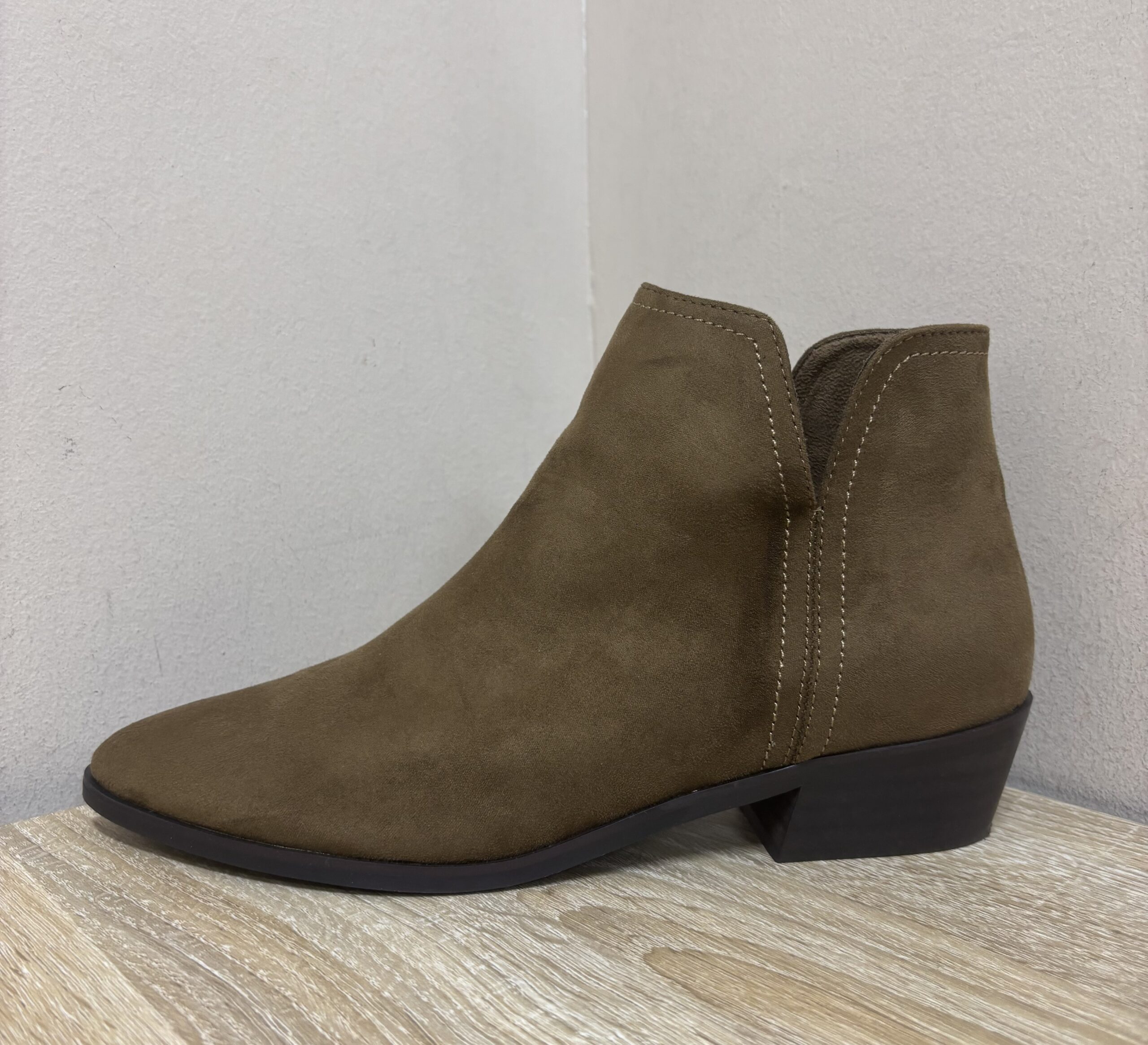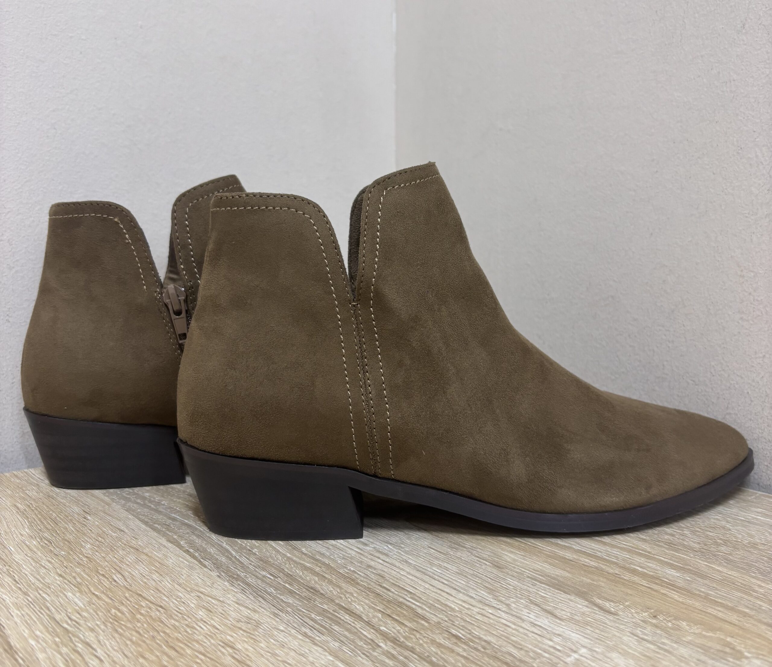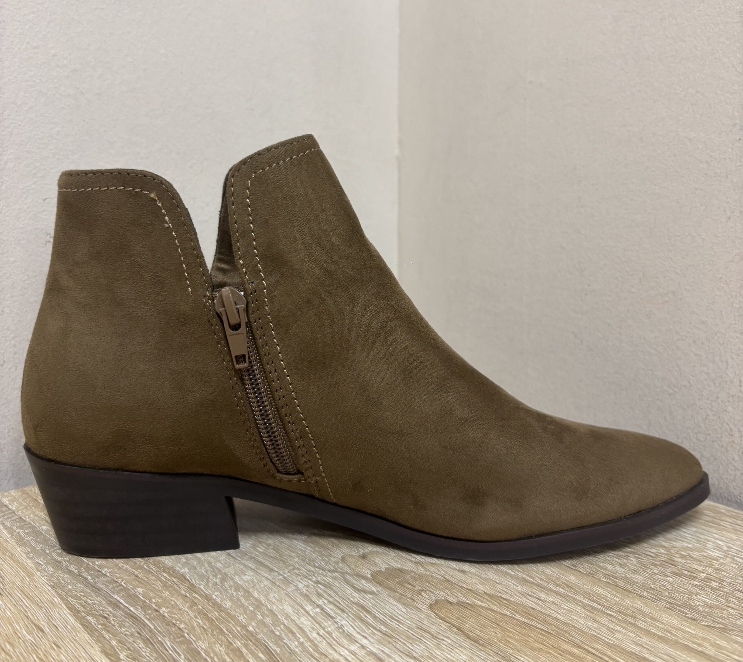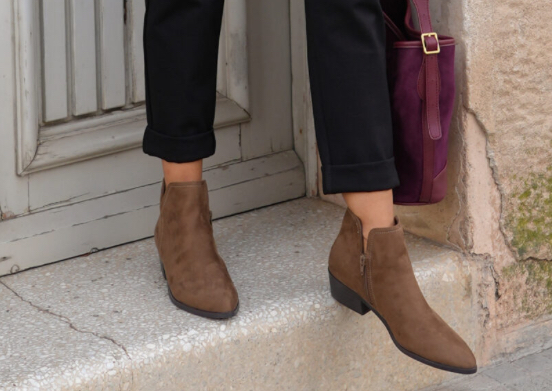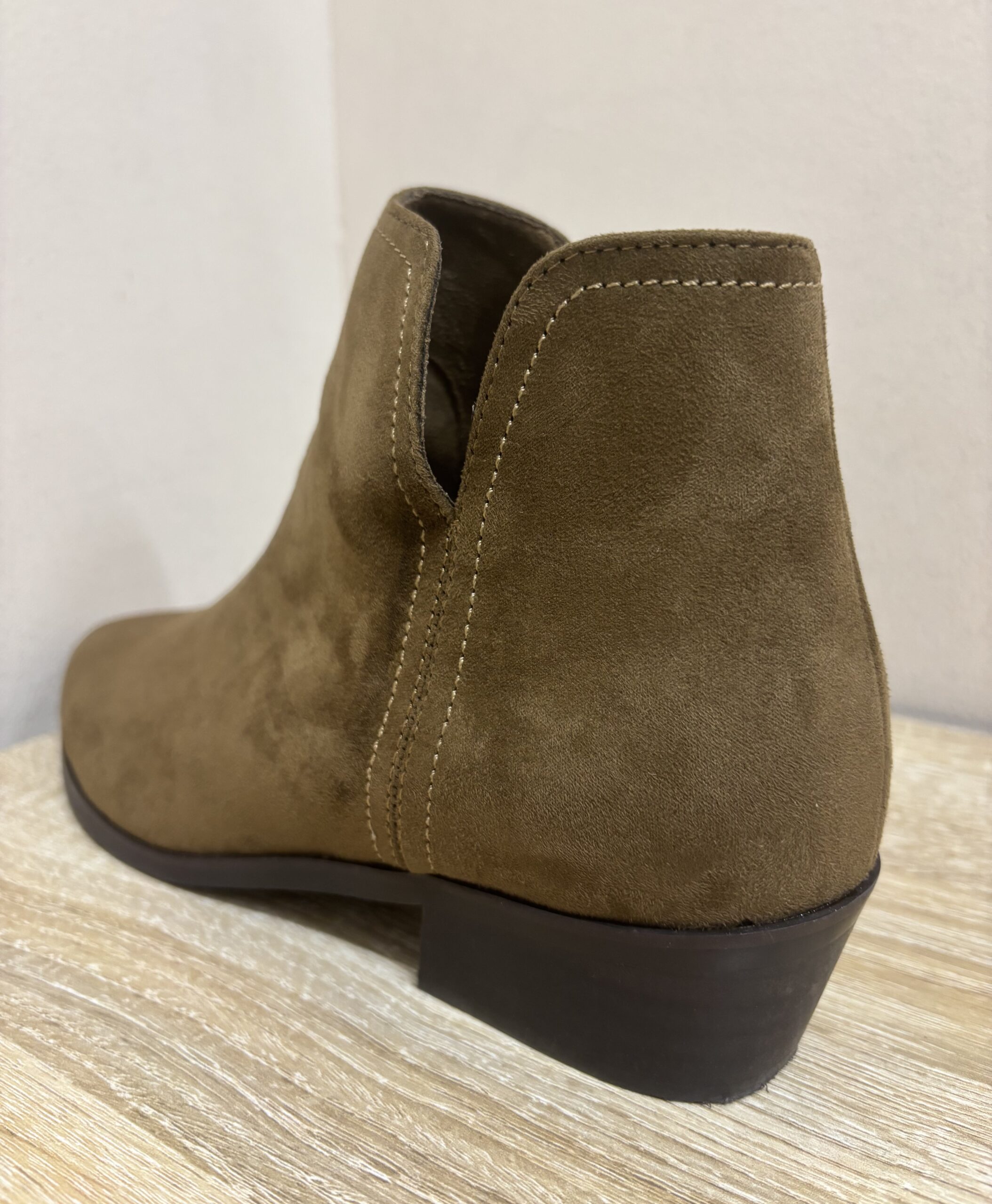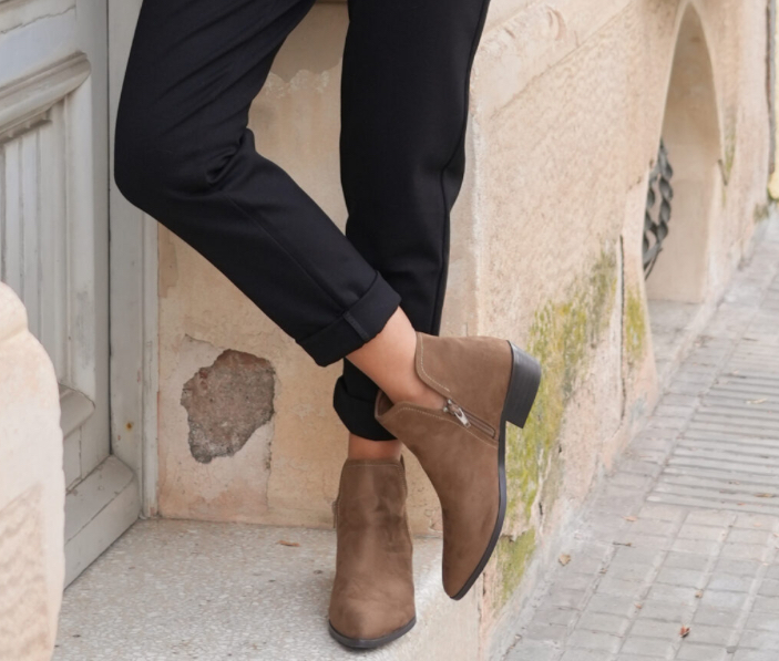 Botas bajas efecto ante en color topo. Cuña de 4 cm., con tacón cuadrado muy cómodo y cierre de cremallera. Plantilla acolchada interior.