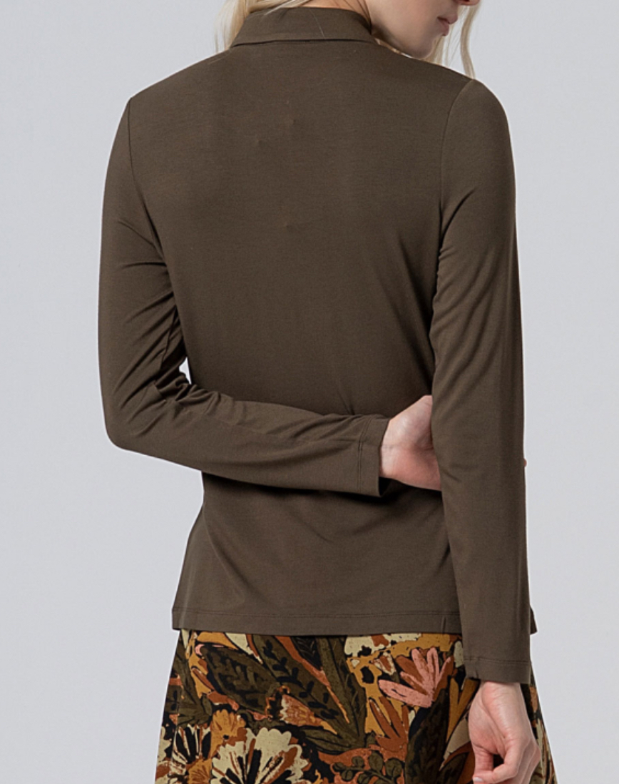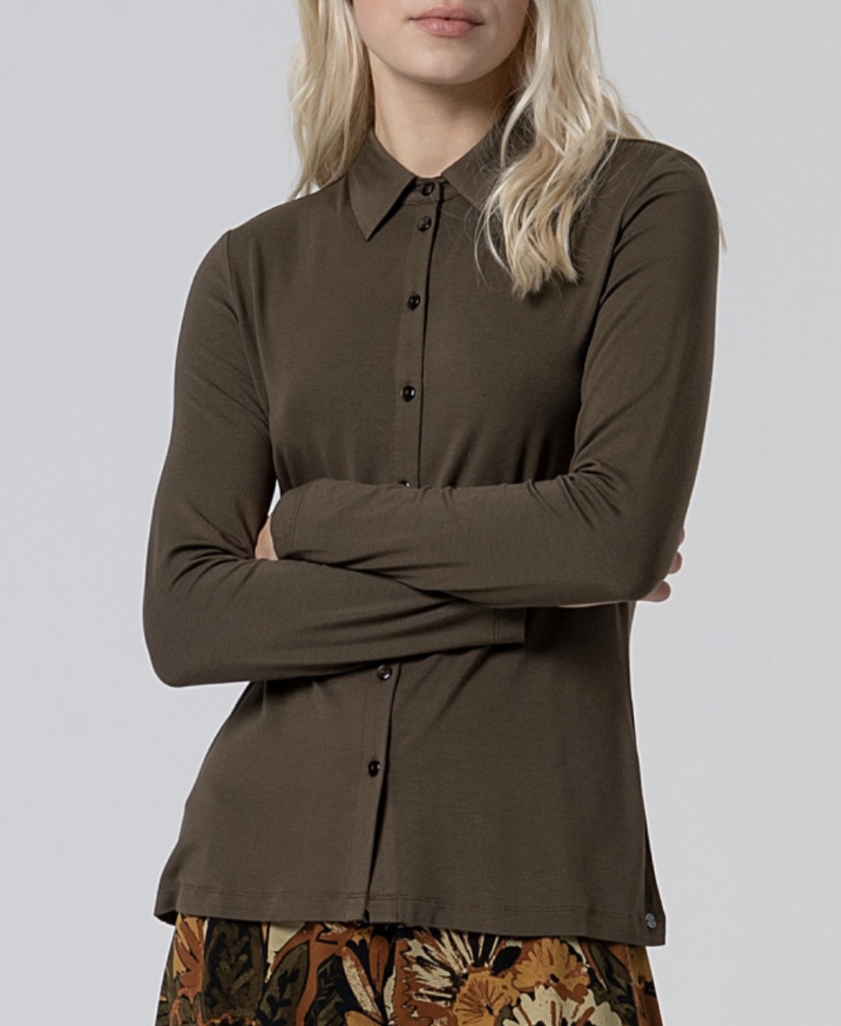 Camisa de manga larga sin puños, cuello camisero y cierre frontal con botones. Confeccionada con tejido elástico muy cómodo y un alto porcentaje de tejido ecológico.