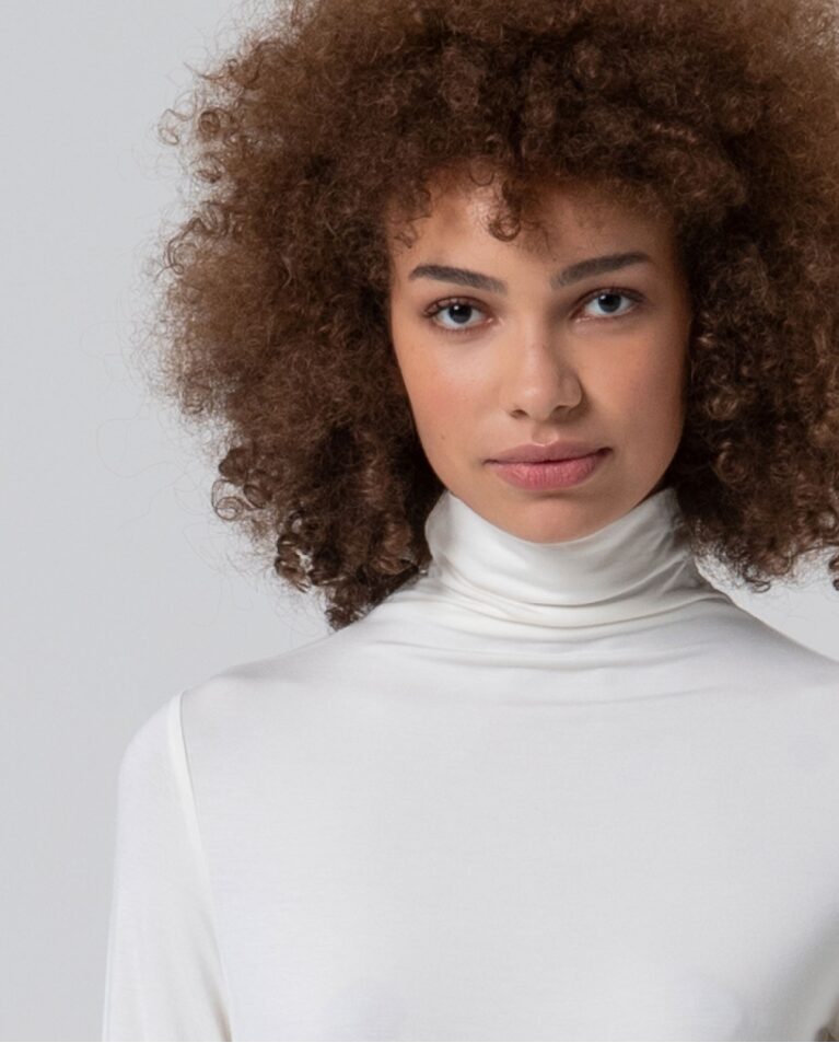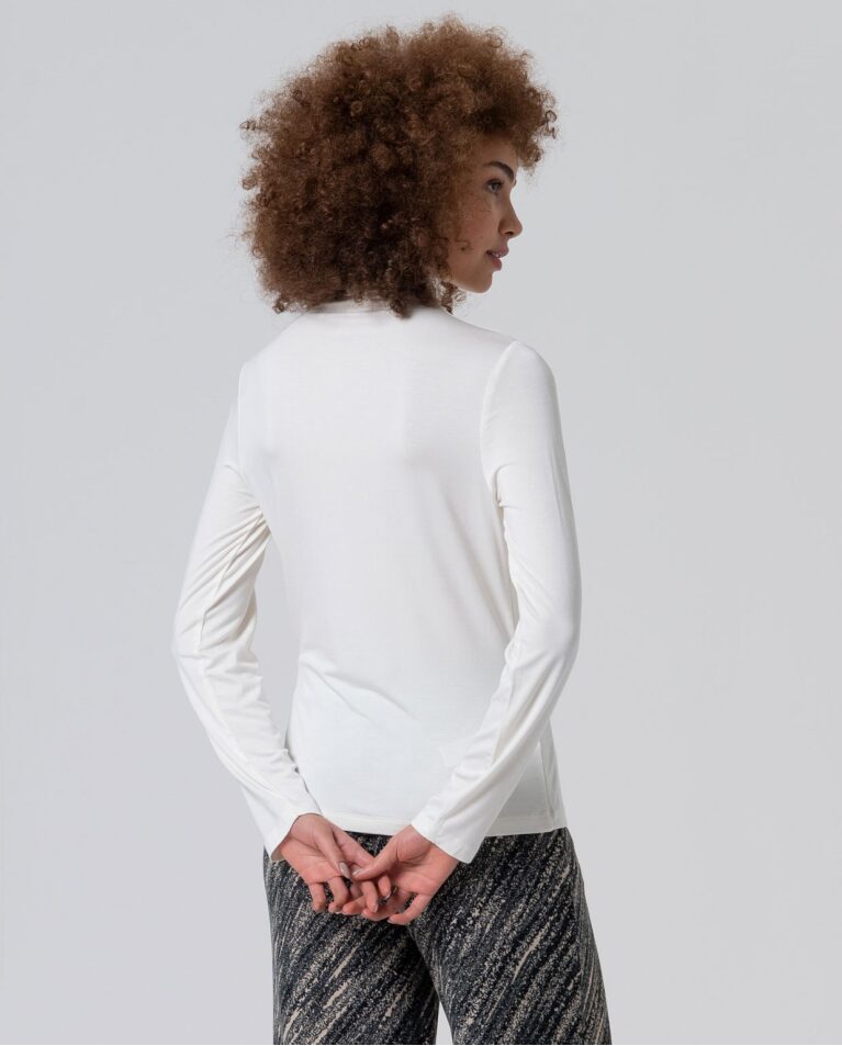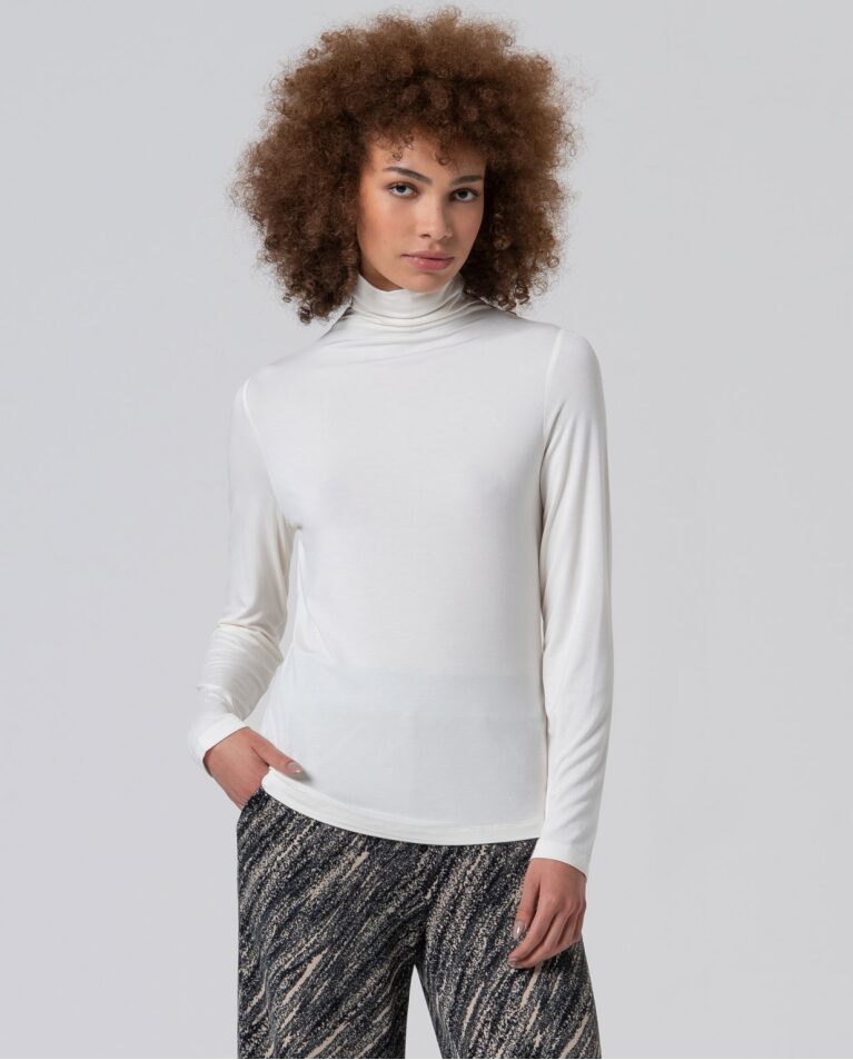 Camiseta entallada de manga larga y cuello perkins. Confeccionada en tejido de bambú suave y elástico. Una prenda básica con un punto de sofisticación, ideal para crear capas o llevar como protagonista en los meses fríos.