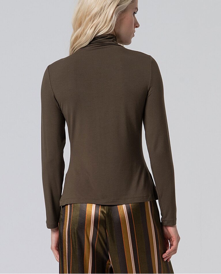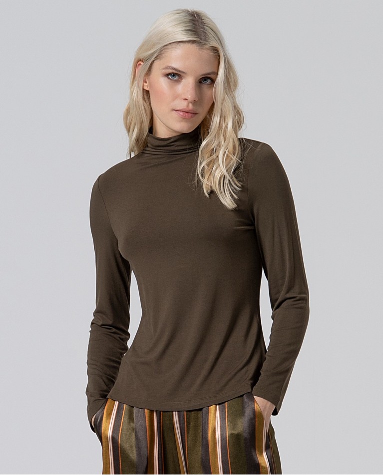 Camiseta entallada de manga larga y cuello perkins. Confeccionada en tejido de bambú suave y elástico. Una prenda básica con un punto de sofisticación, ideal para crear capas o llevar como protagonista en los meses fríos.