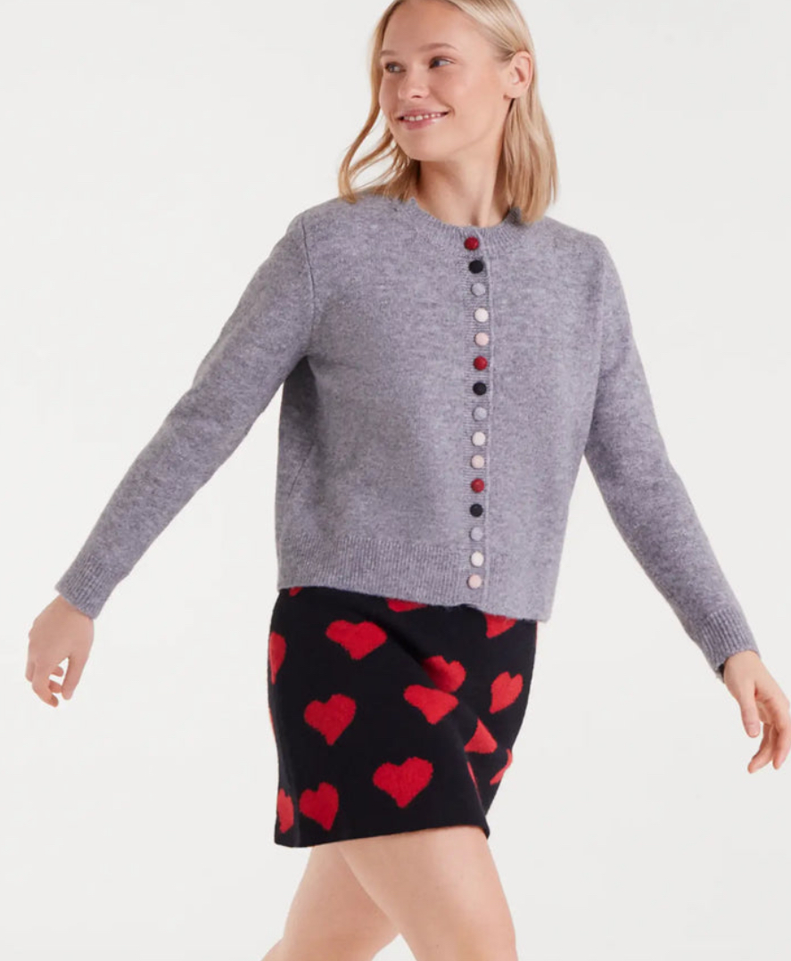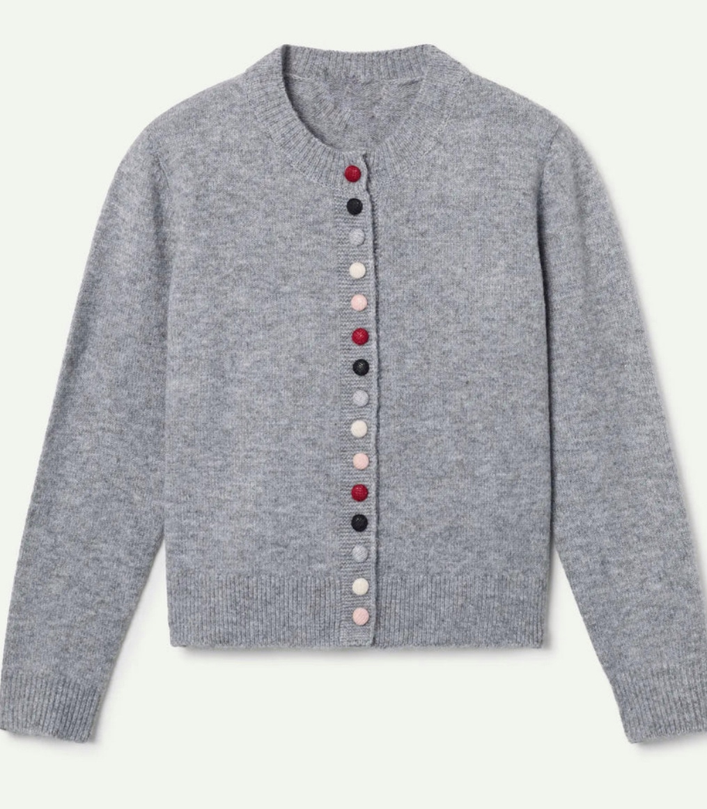 Cárdigan de punto en color gris. Cuello redondo y manga larga. Cierre frontal con detalle de botones multicolor que lo hacen especial y divertido. Tejido suave y corte recto.