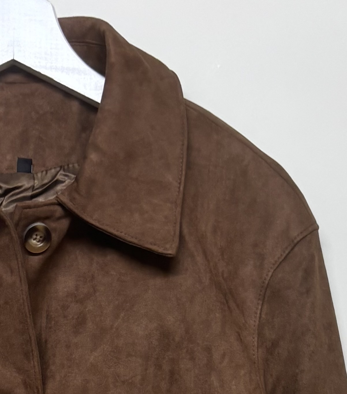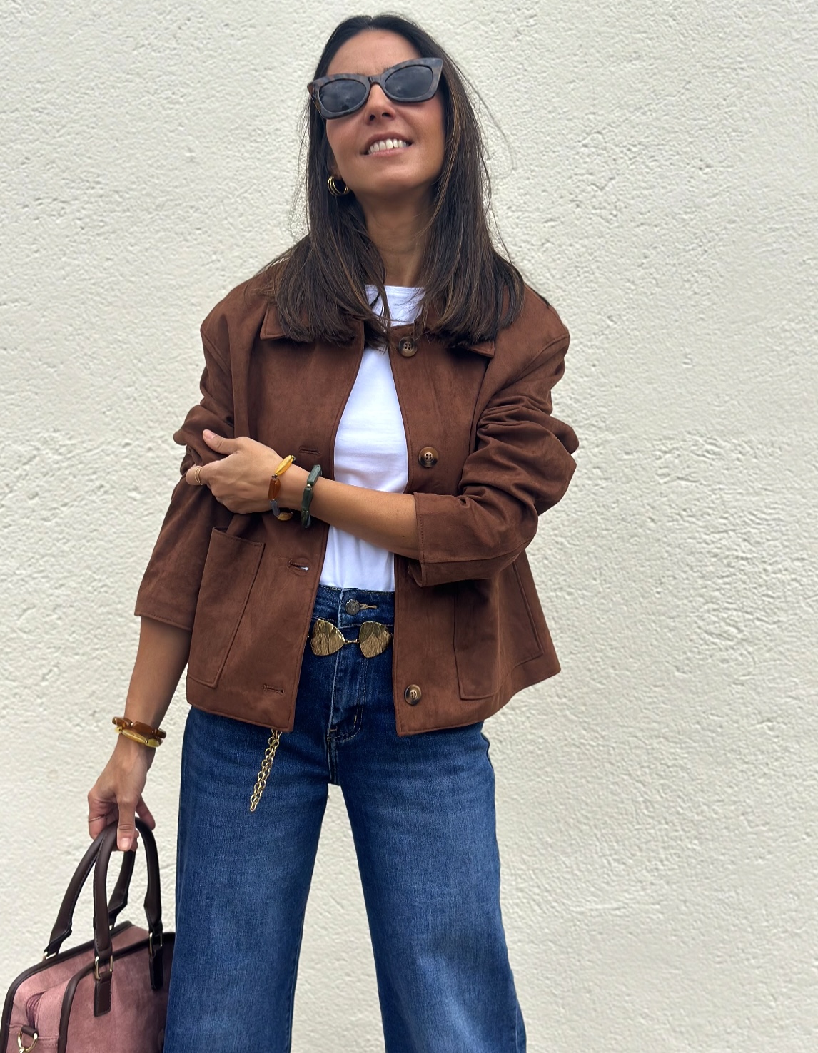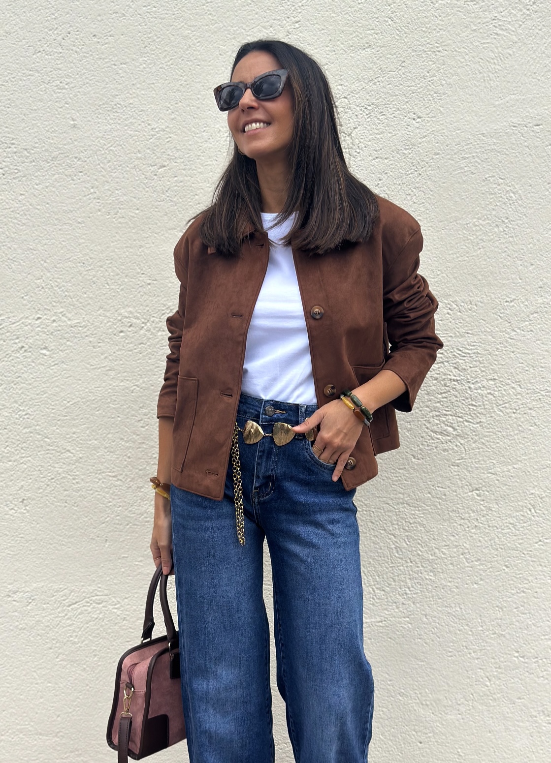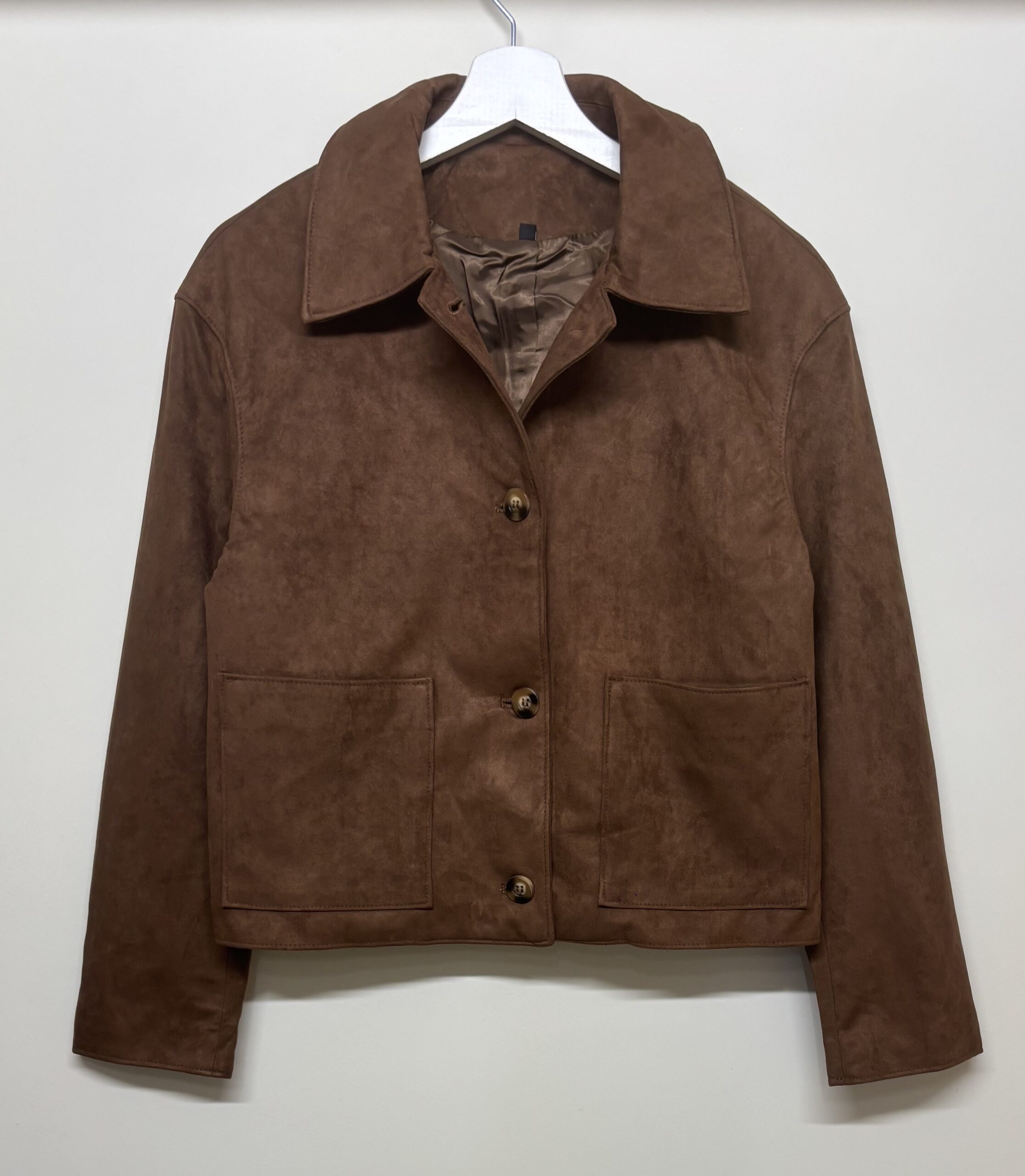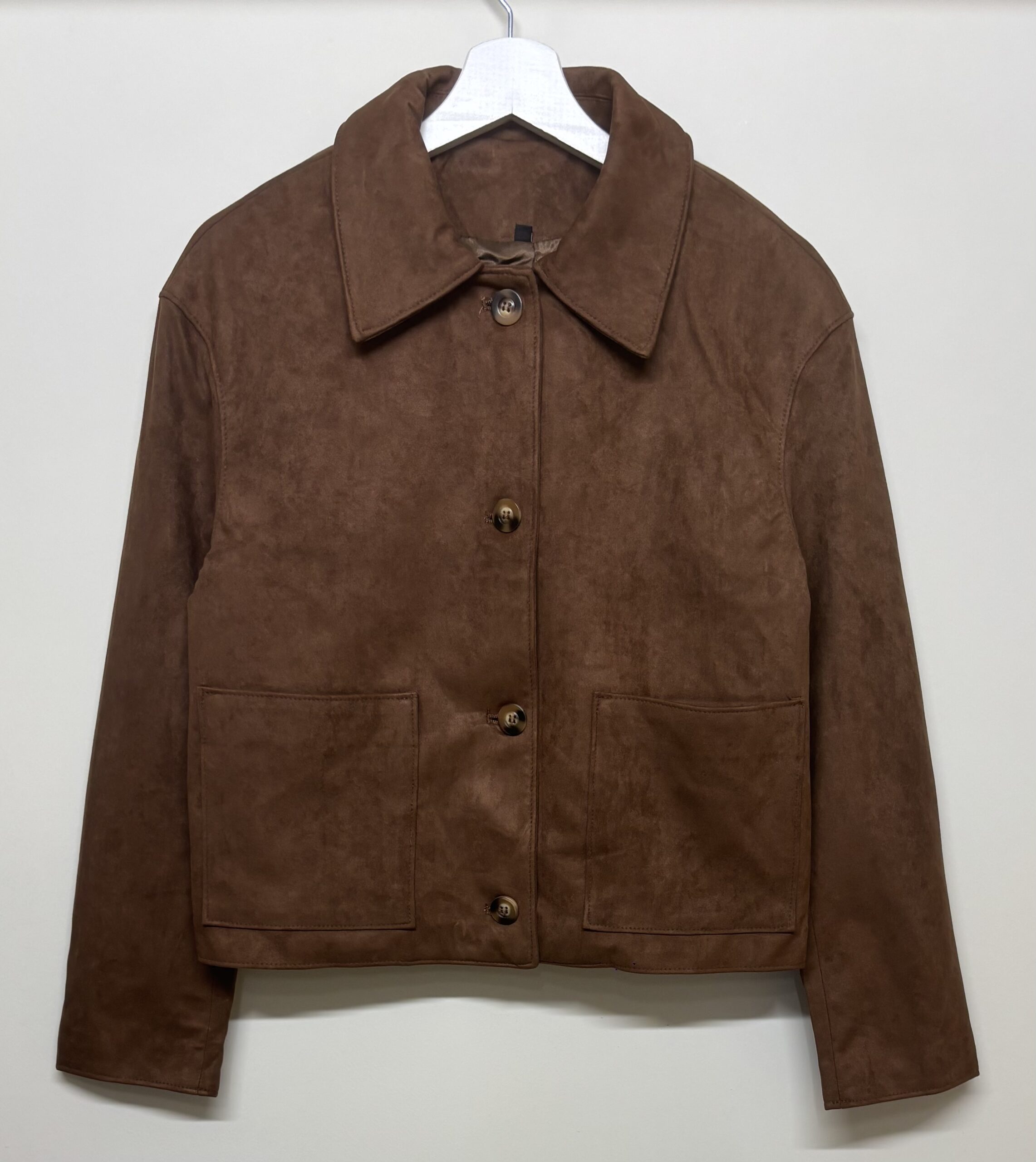 Cazadora corta de antelina en marrón, corte recto. Abotonada y con detalle de bolsillos frontales. Una pieza clásica de fondo de armario muy viral esta temporada, no la puedes dejar escapar. Ligera y fácil de combinar.