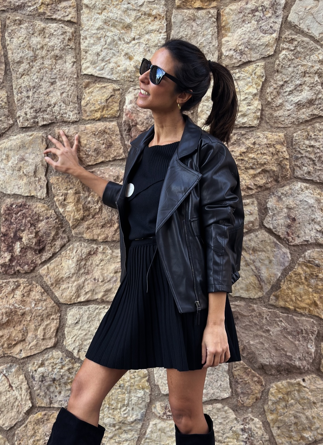 Cazadora corta de ecopiel negra, corte similar a una bomber. Cierre cruzado con cremallera, forrada y ligera. Una pieza clásica de fondo de armario muy viral esta temporada, no la puedes dejar escapar.