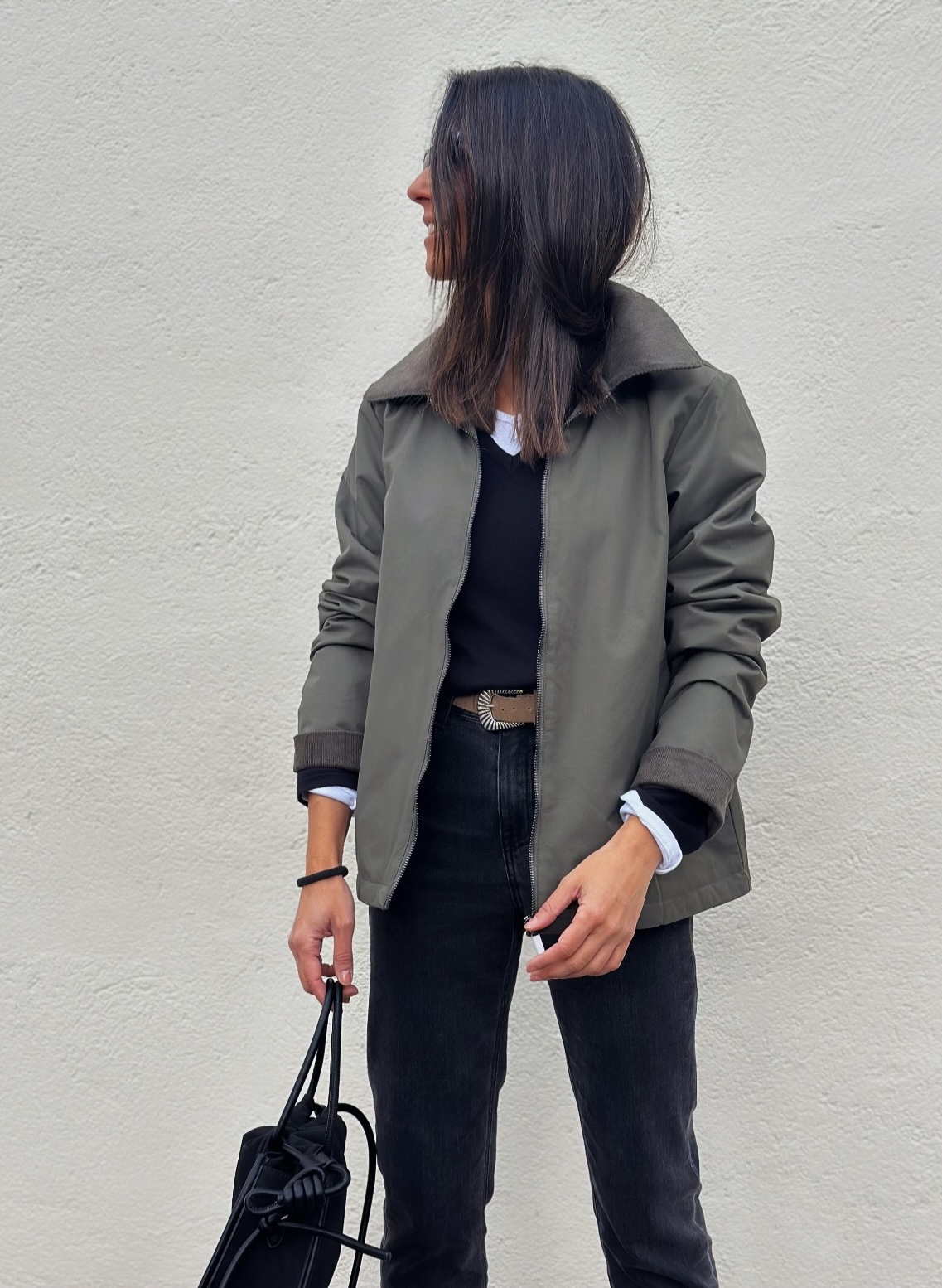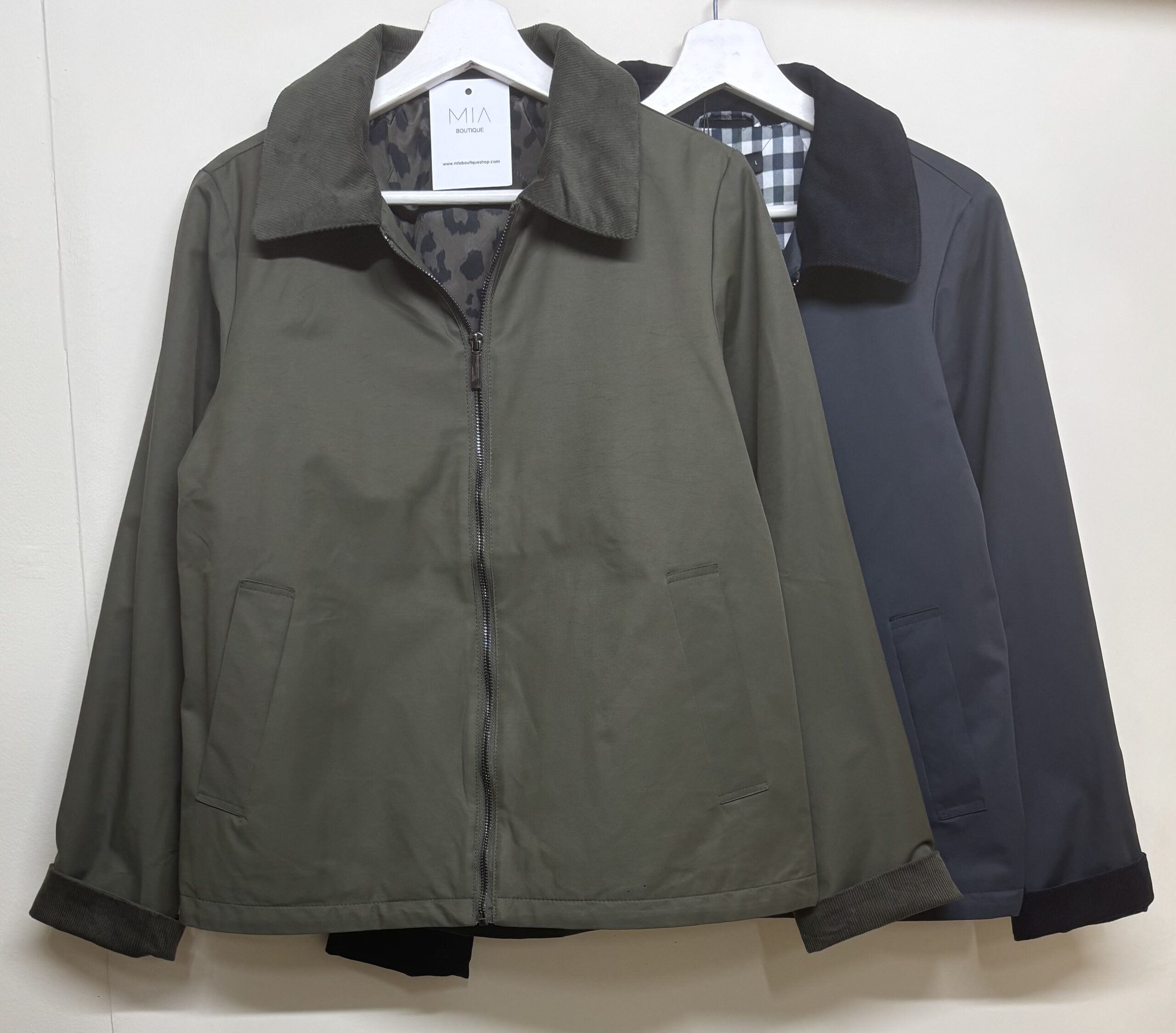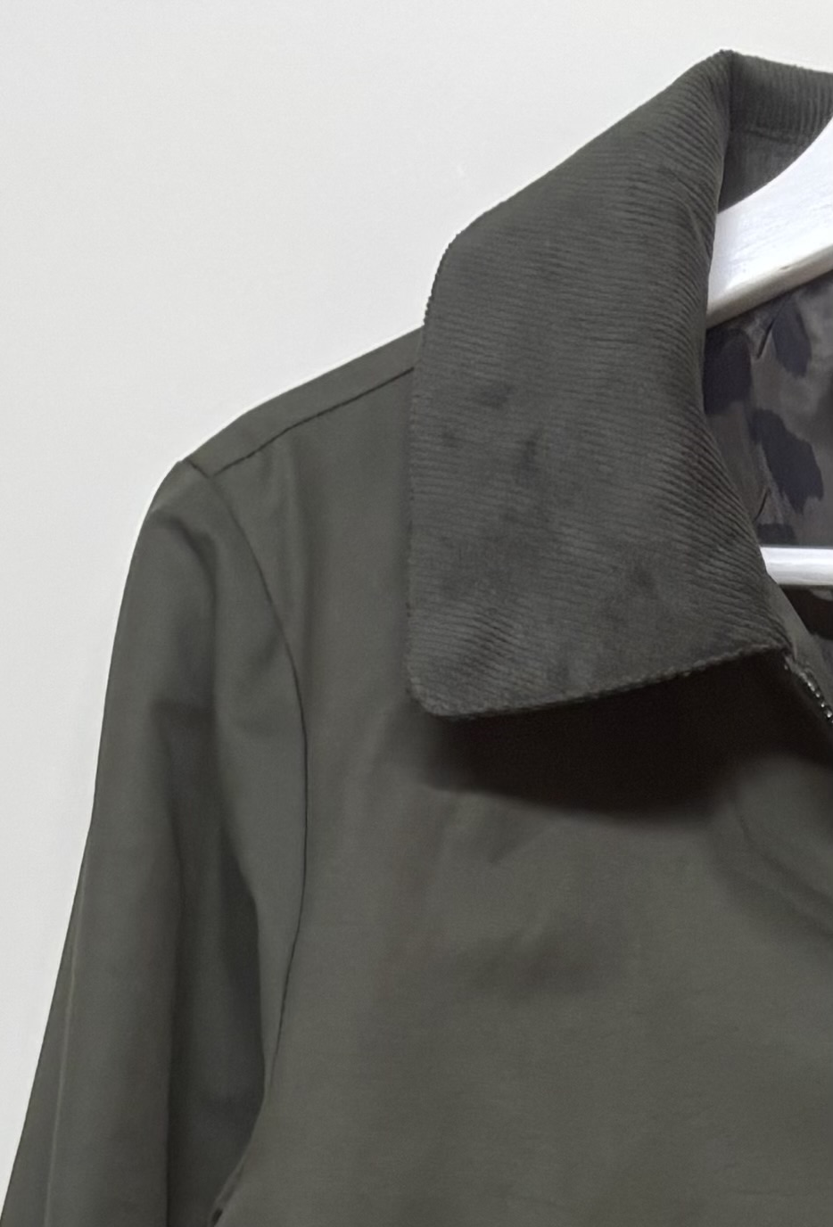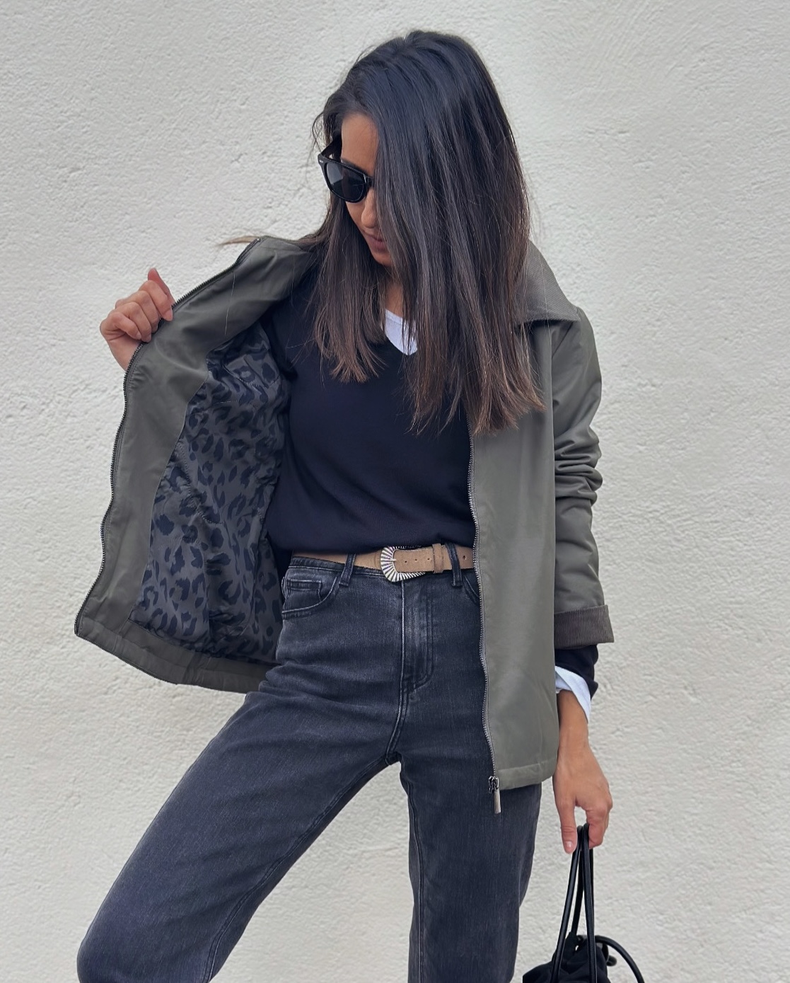 Chaqueta tipo cazadora de un acolchado medio, ligera y fácil de combinar. Detalle de pana en el mismo tono en puño y cuello, forra de animal print al tono, cierre con cremallera y bolsillos laterales. Una prenda de fondo de armario que llevarás para todos tus looks diarios.