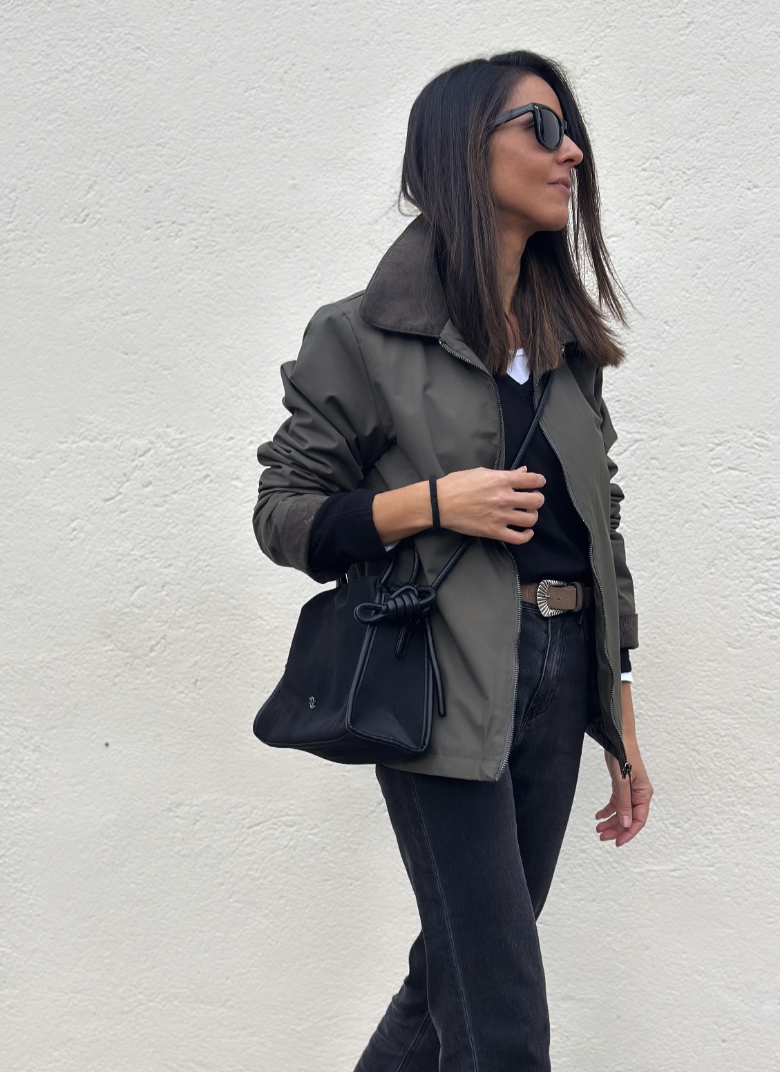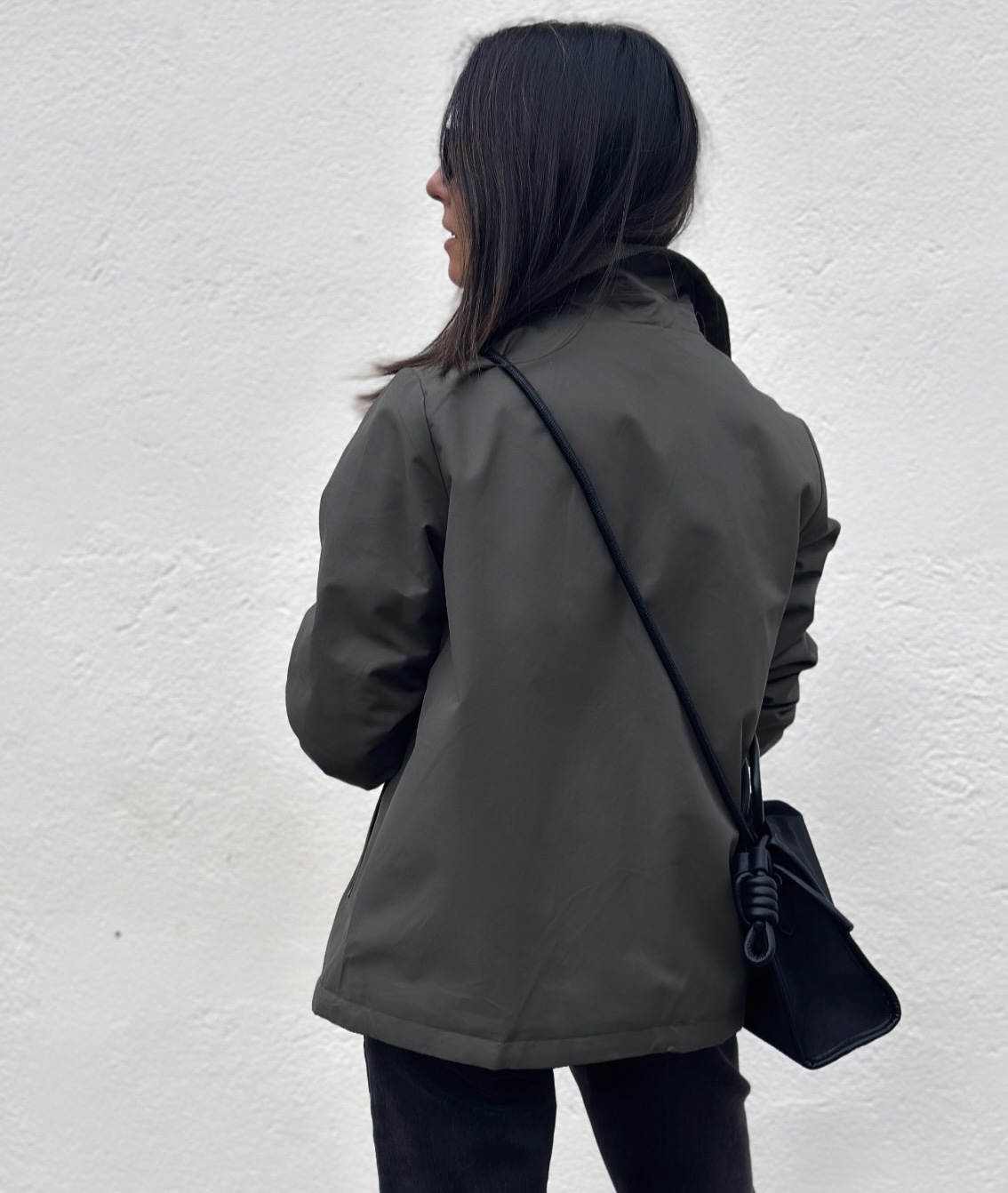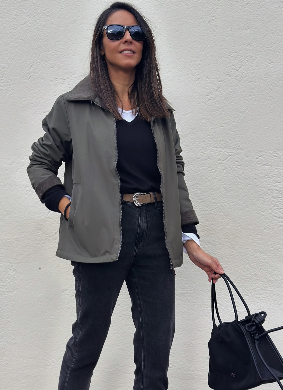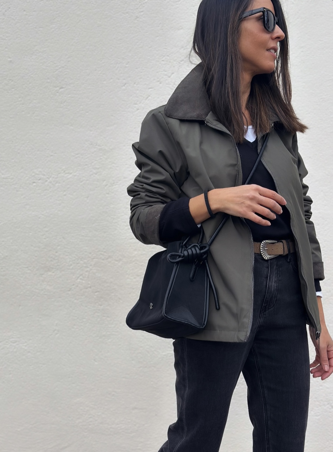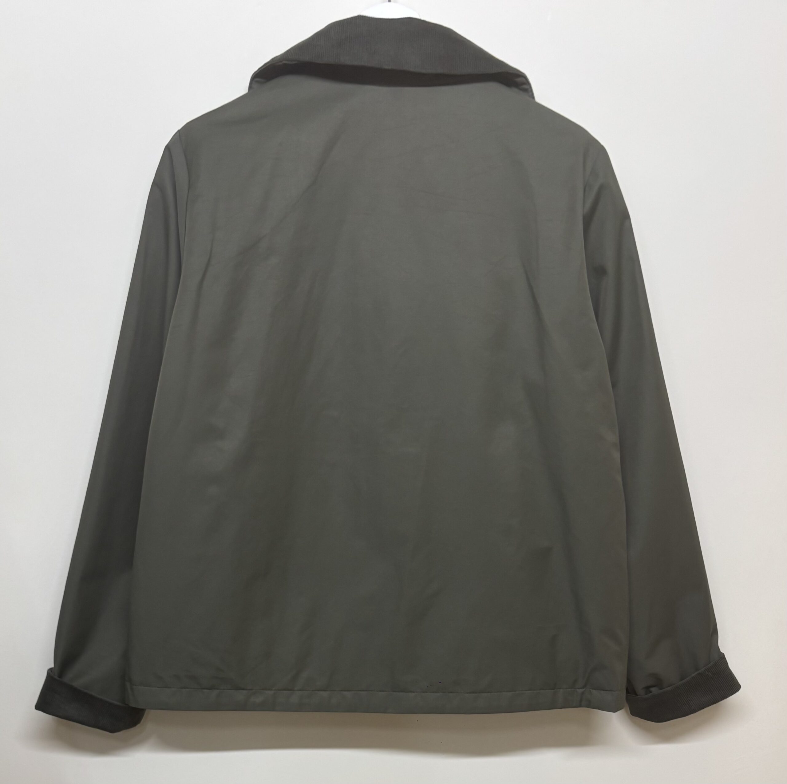 Chaqueta tipo cazadora de un acolchado medio, ligera y fácil de combinar. Detalle de pana en el mismo tono en puño y cuello, forra de animal print al tono, cierre con cremallera y bolsillos laterales. Una prenda de fondo de armario que llevarás para todos tus looks diarios.