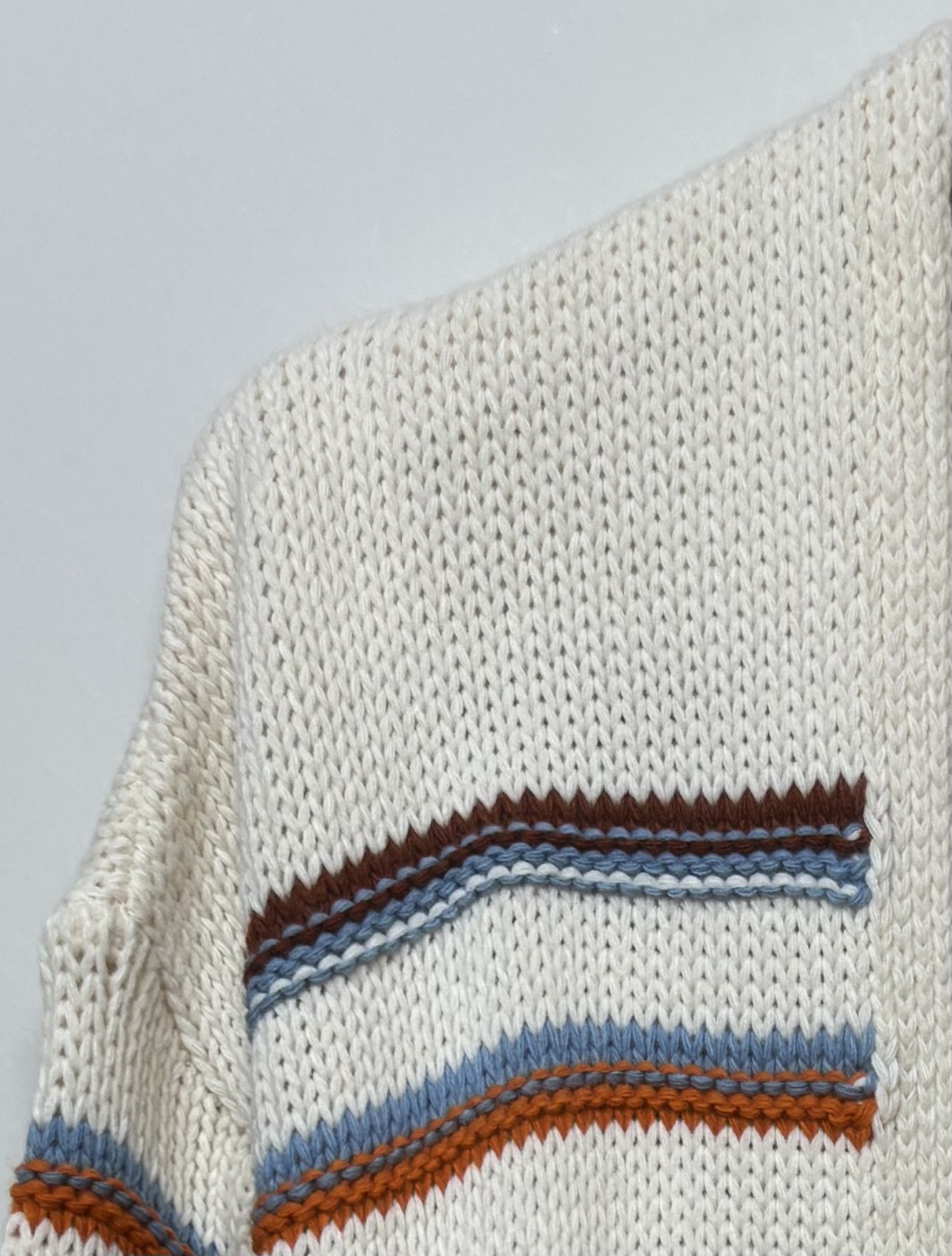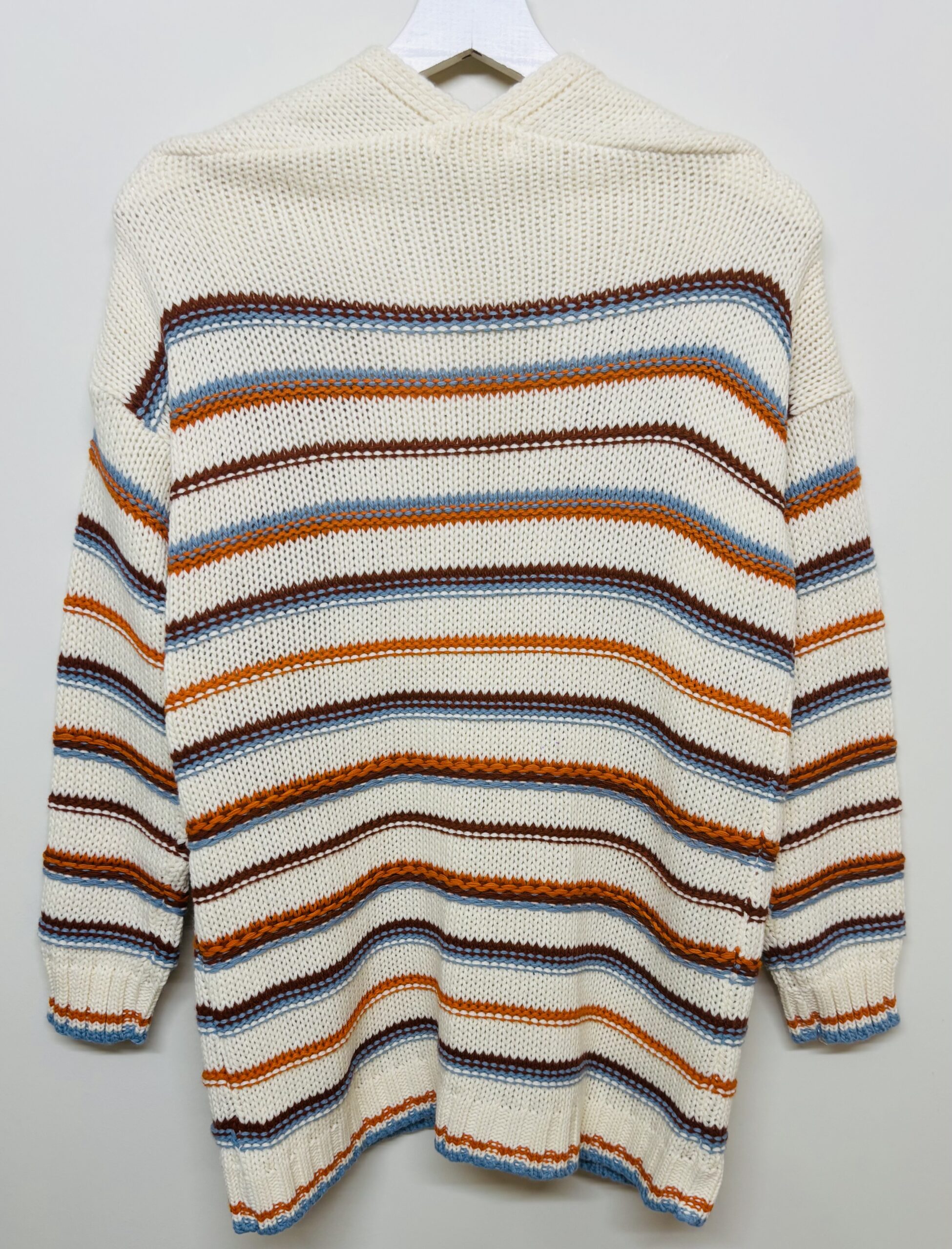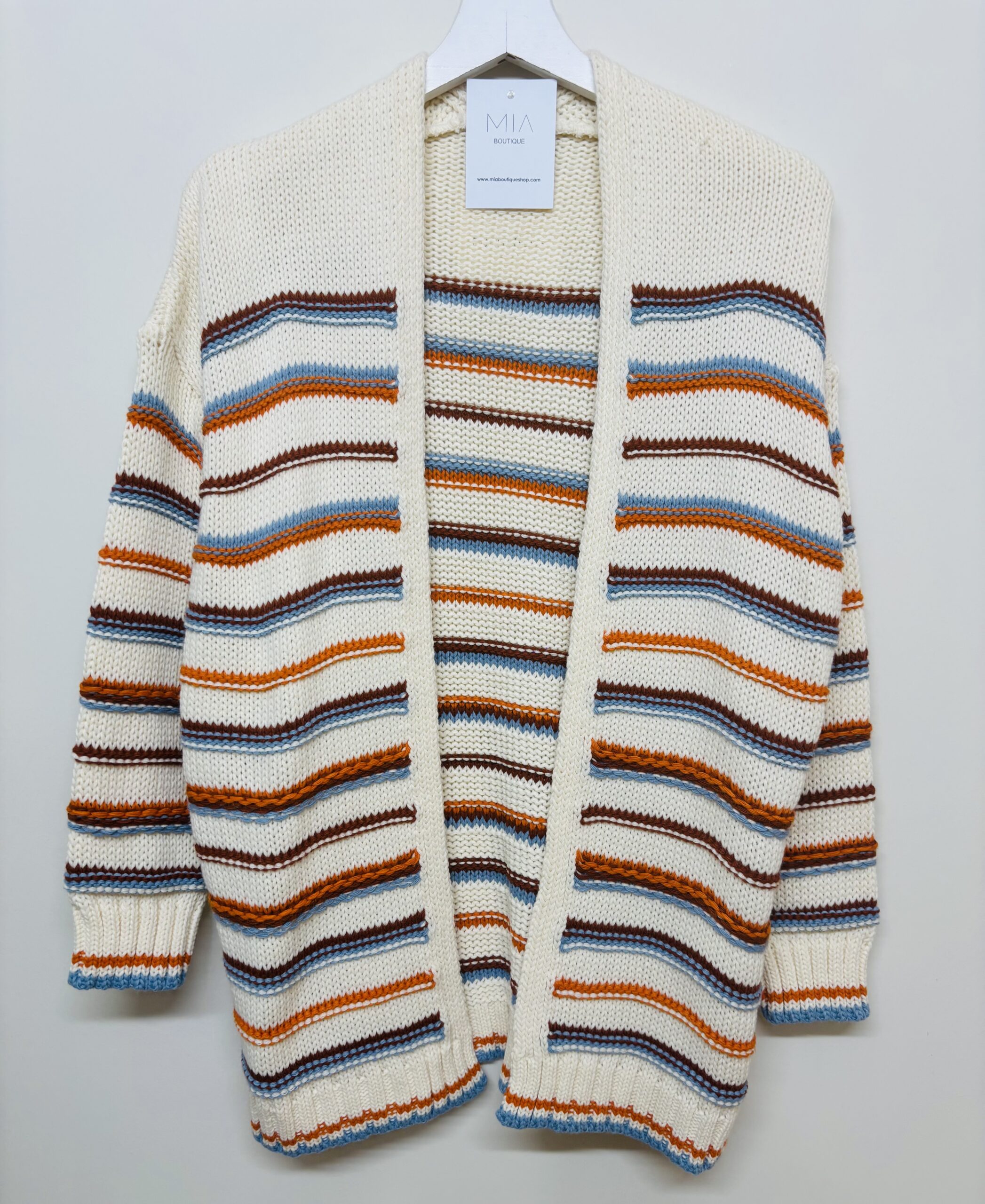 Chaqueta de punto suave en color crudo a rayas teja, burdeos y azul. Abierto, corte recto. Una prenda perfecta para cualquier ocasión.