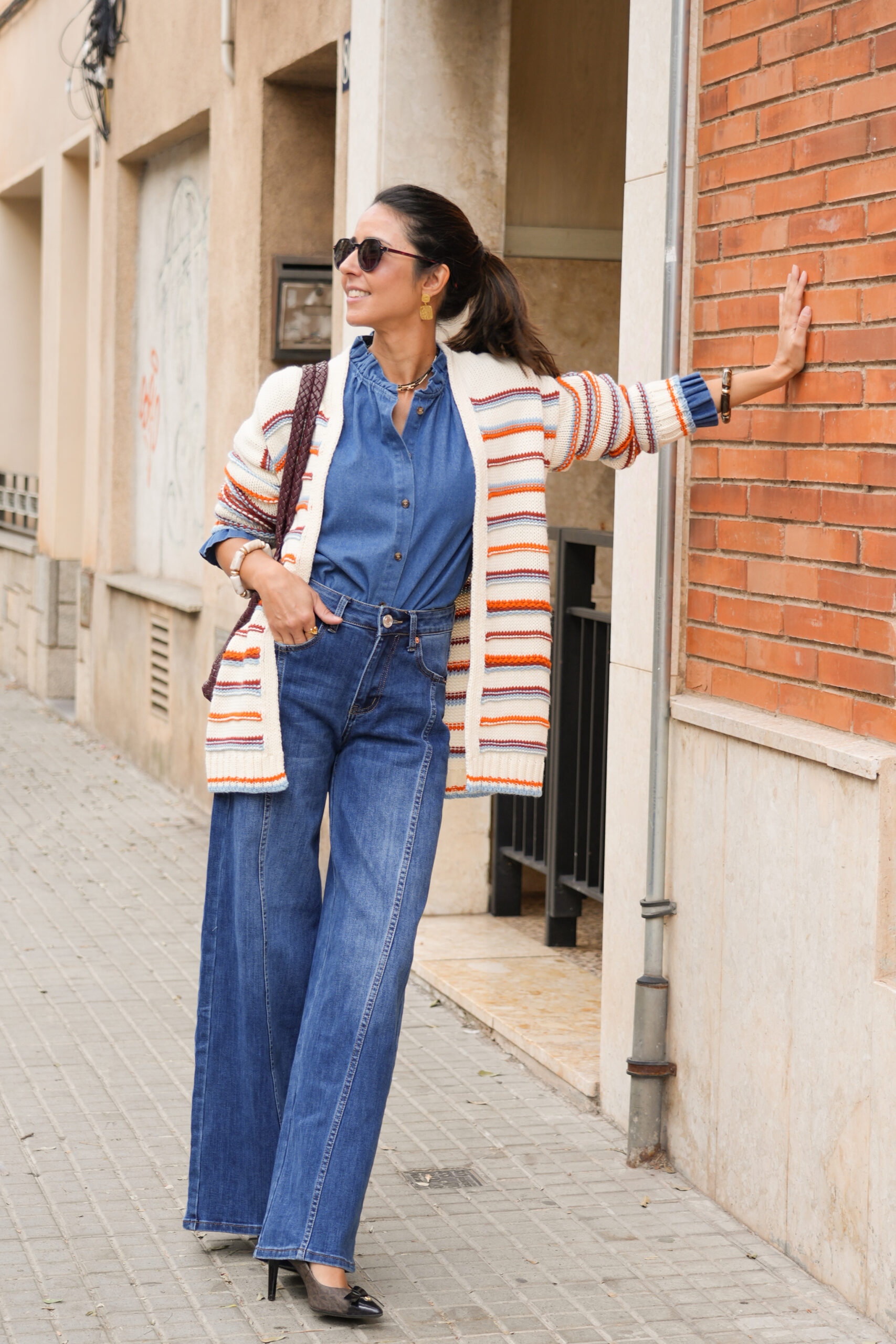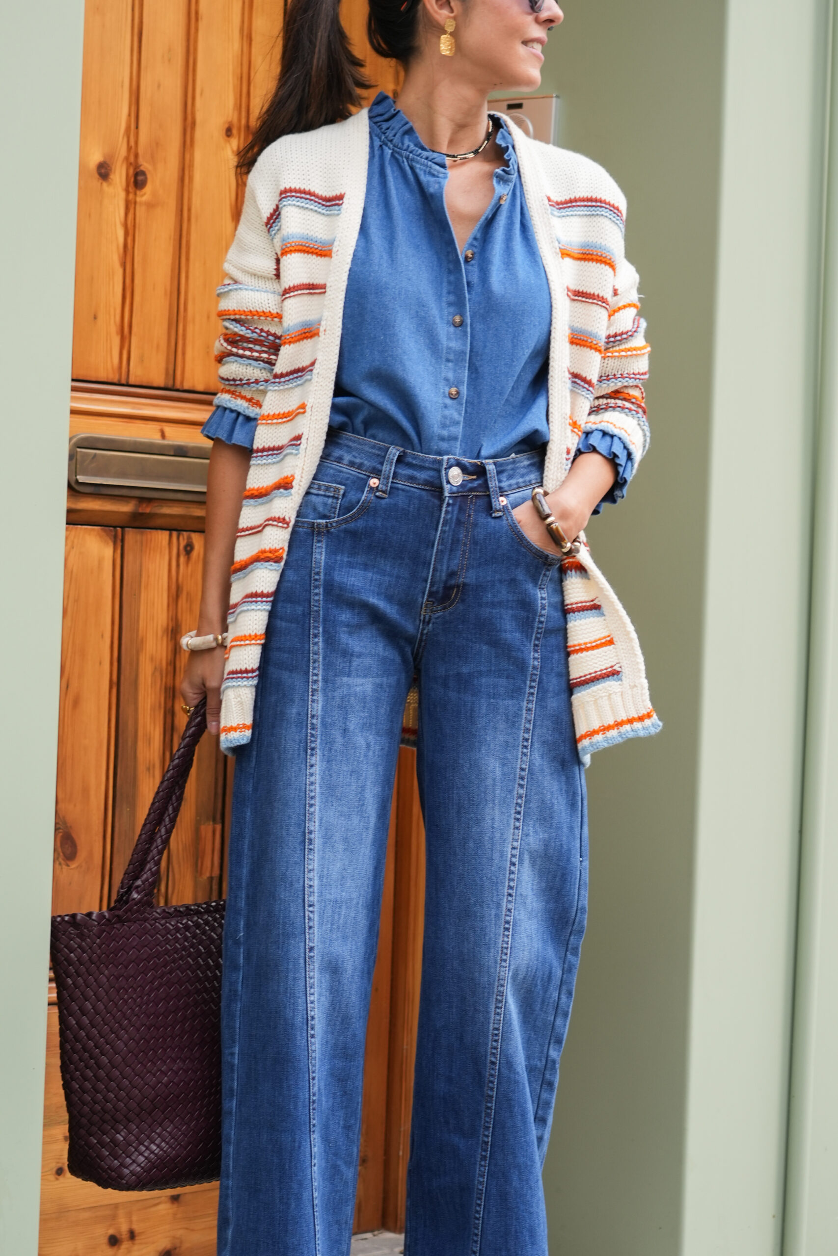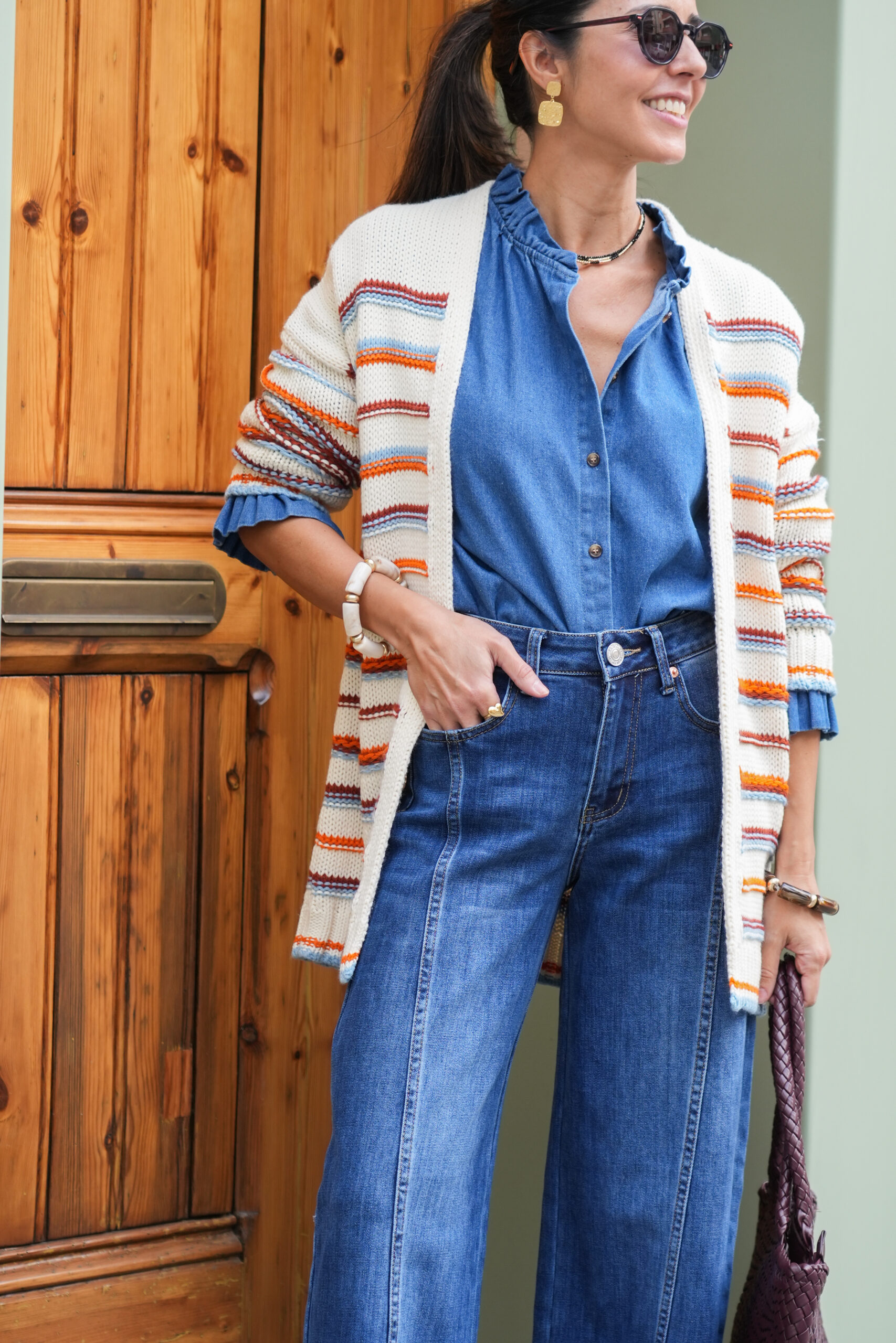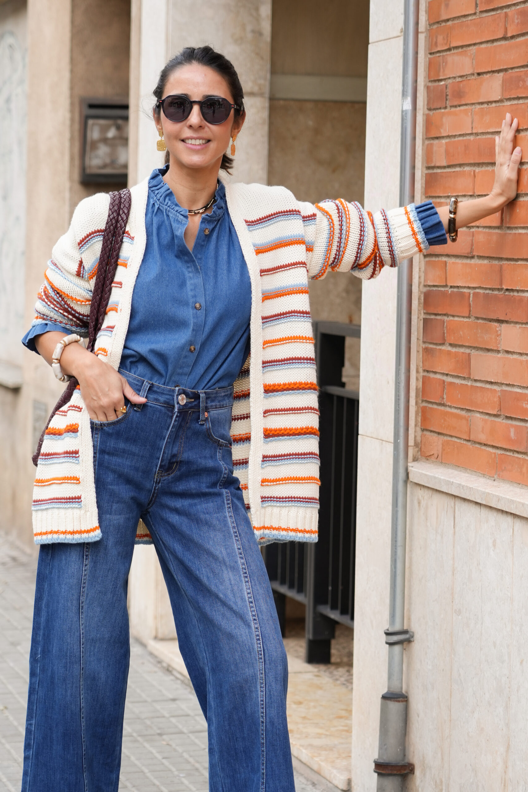 Chaqueta de punto suave en color crudo a rayas teja, burdeos y azul. Abierto, corte recto. Una prenda perfecta para cualquier ocasión.
