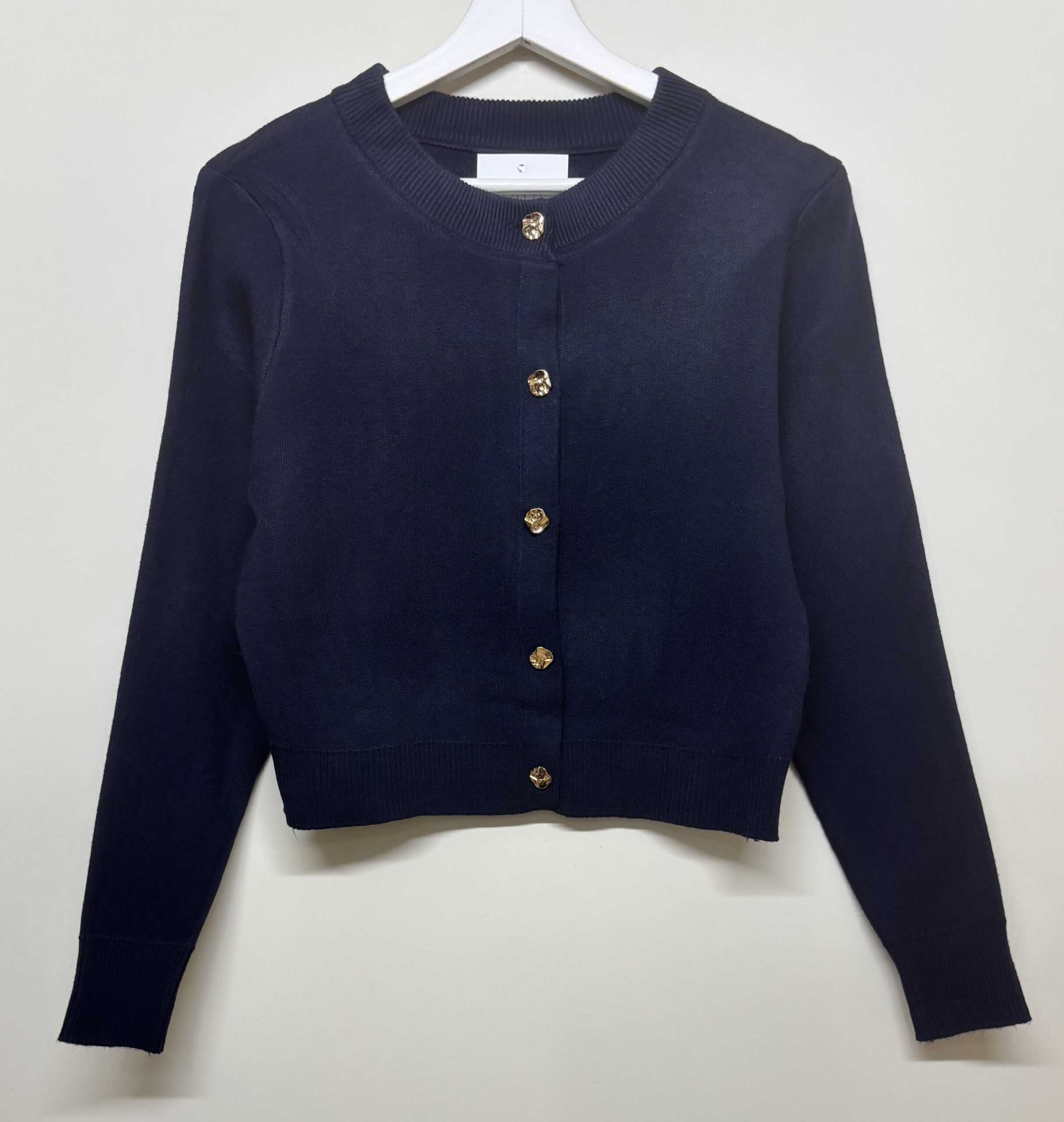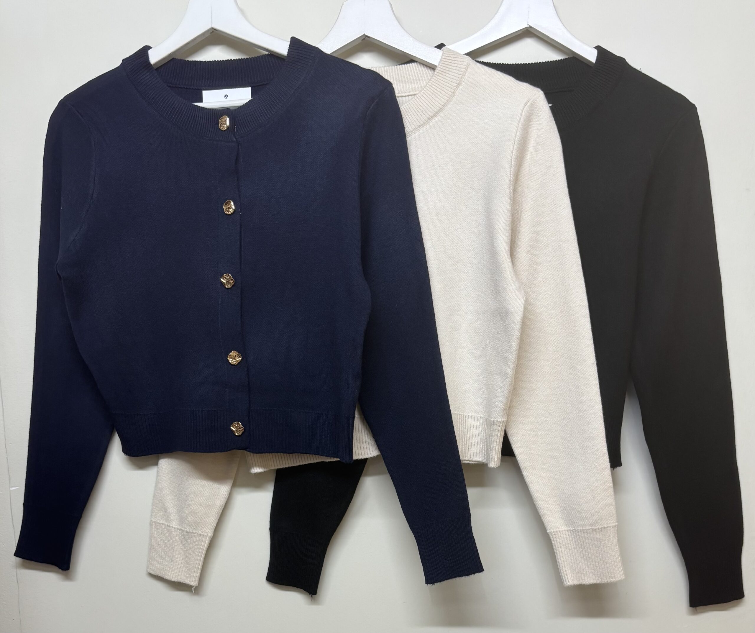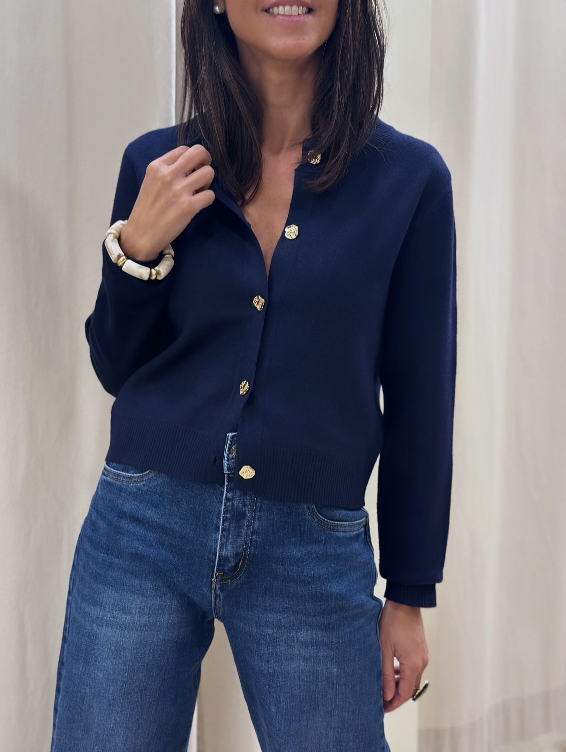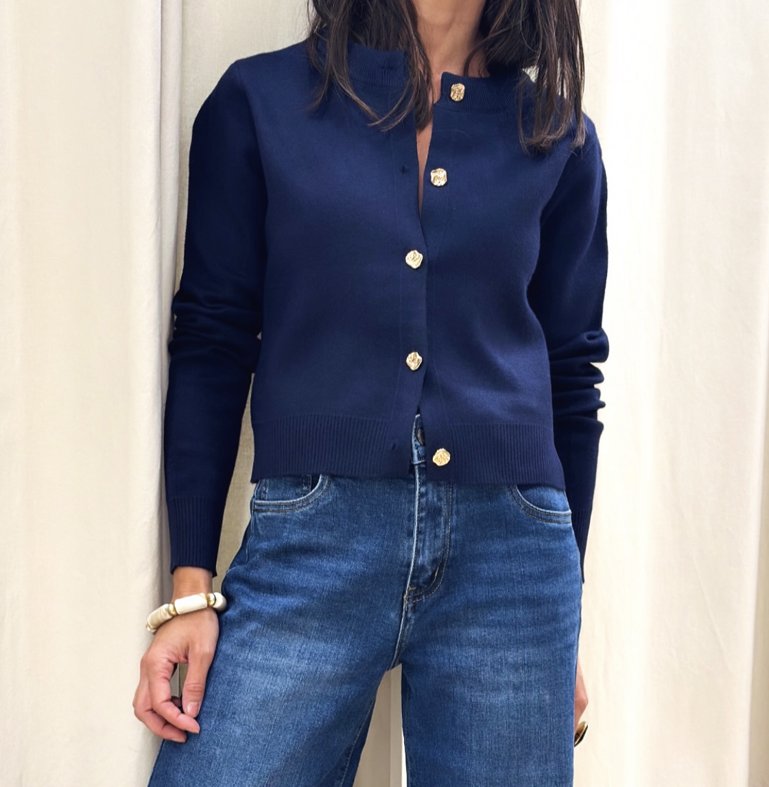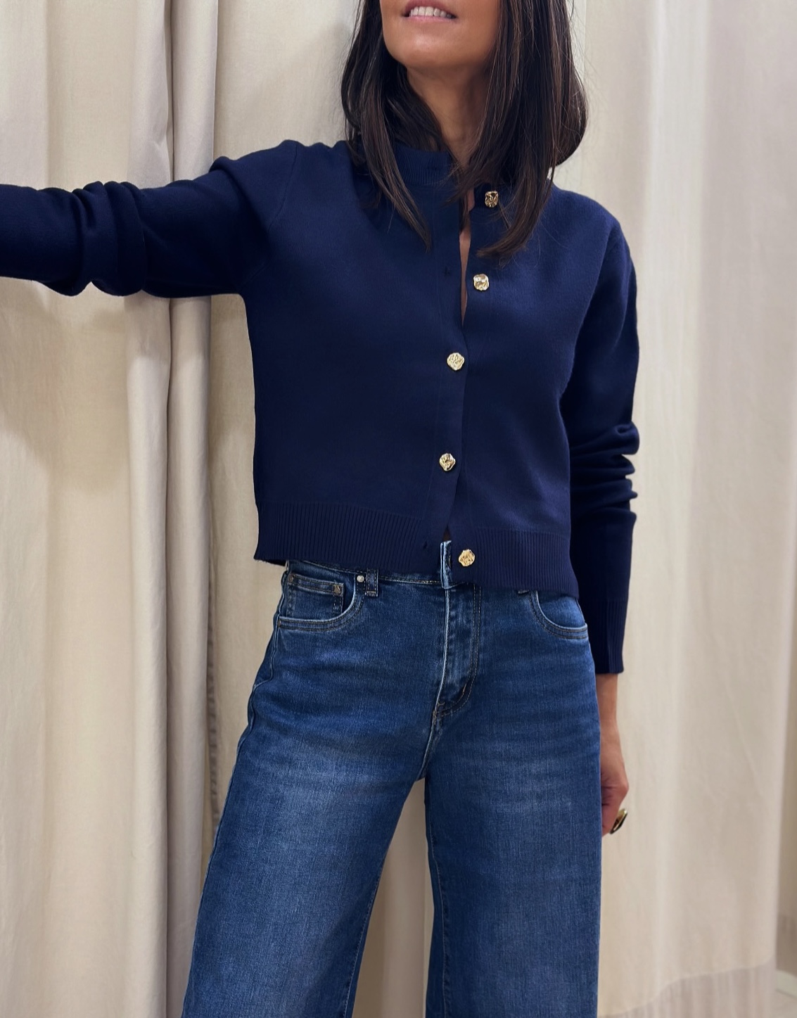 Cárdigan de punto suave con detalle de botones dorados. Corte crop. Una chaqueta muy versátil, puede llevarse a la oficina pero también para un look más casual. De esas prendas que seguro necesitas en tu armario.