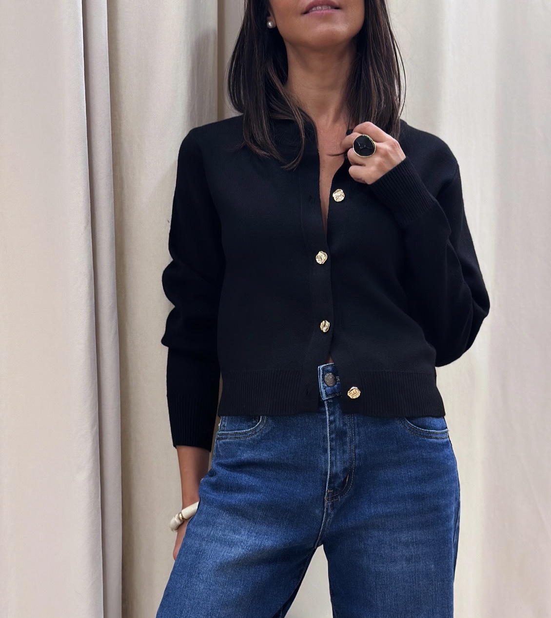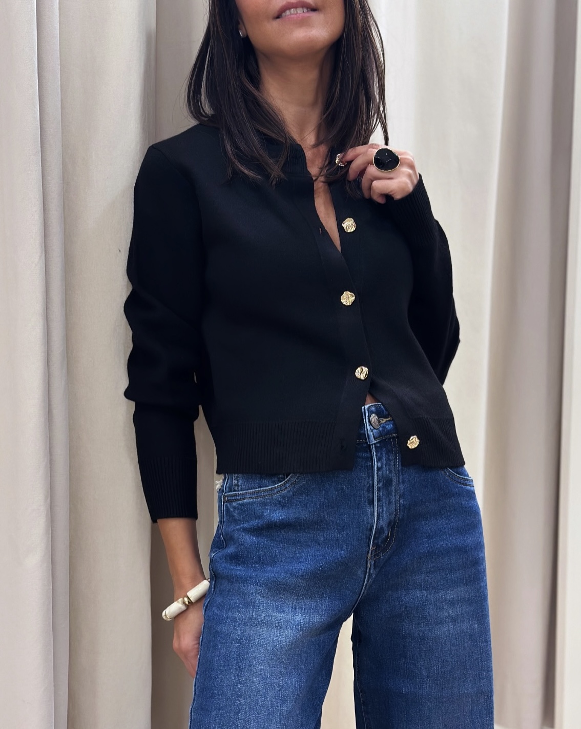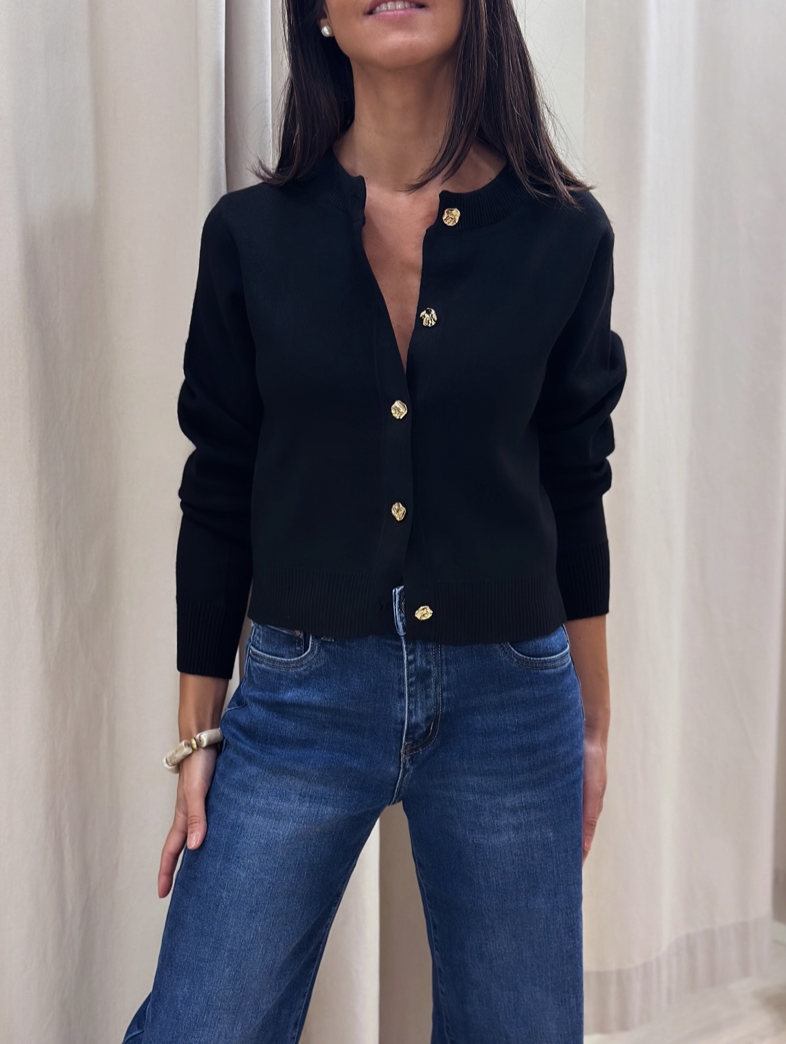 Cárdigan de punto suave con detalle de botones dorados. Corte crop. Una chaqueta muy versátil, puede llevarse a la oficina pero también para un look más casual. De esas prendas que seguro necesitas en tu armario.
