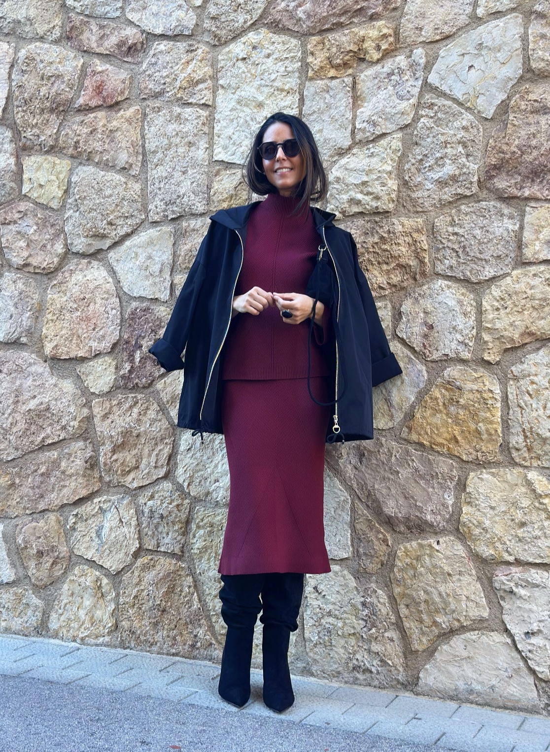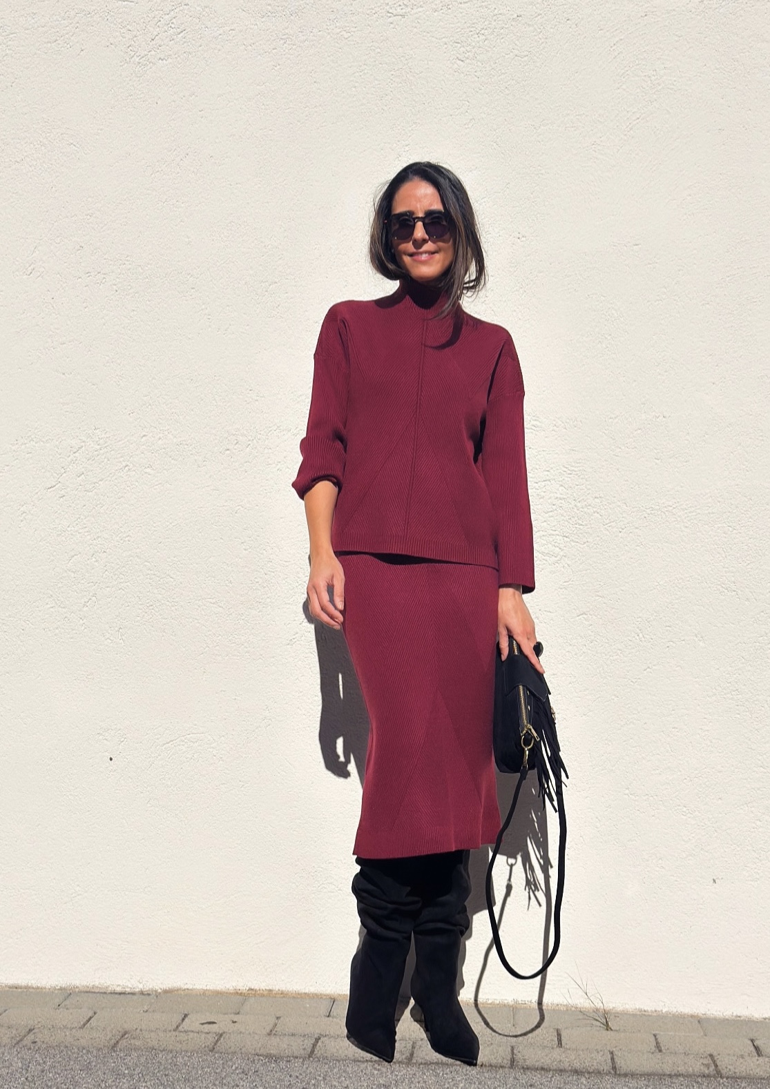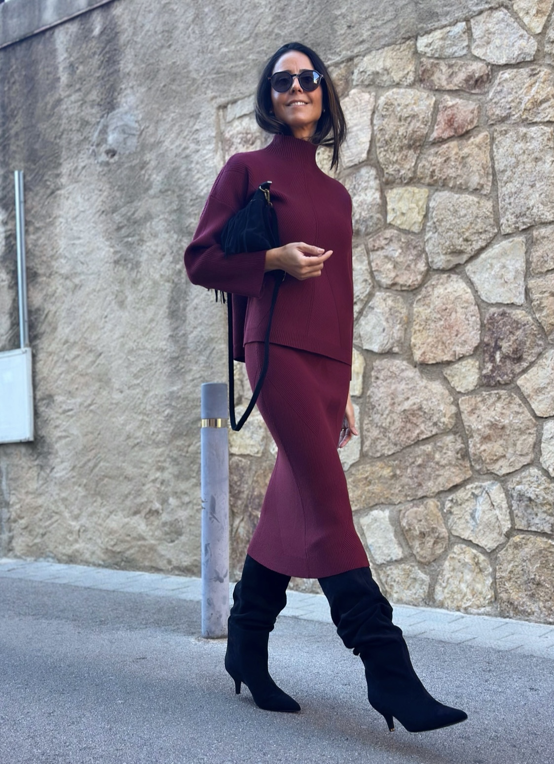 Conjunto de punto compuesto por una falda midi y un jersey de cuello perkins. Falda tipo lápiz con elástico en la cintura y ajustable al cuerpo, y jersey de corte recto. Un total look muy llevable, que puedes lucir más casual o más elegante en función de los complementos. Añádele un poncho para realzar el outfit.