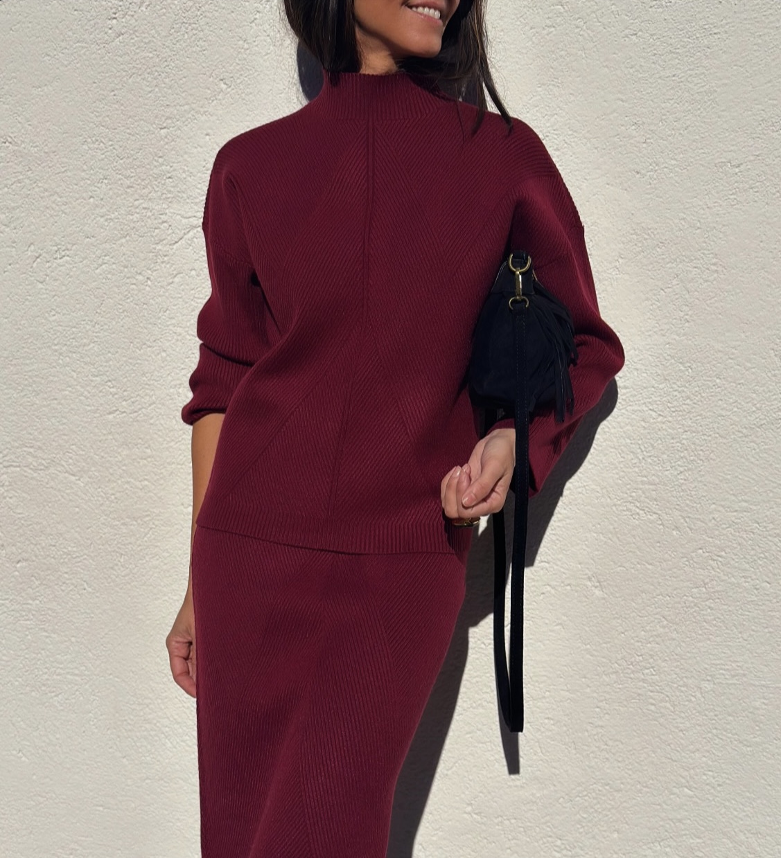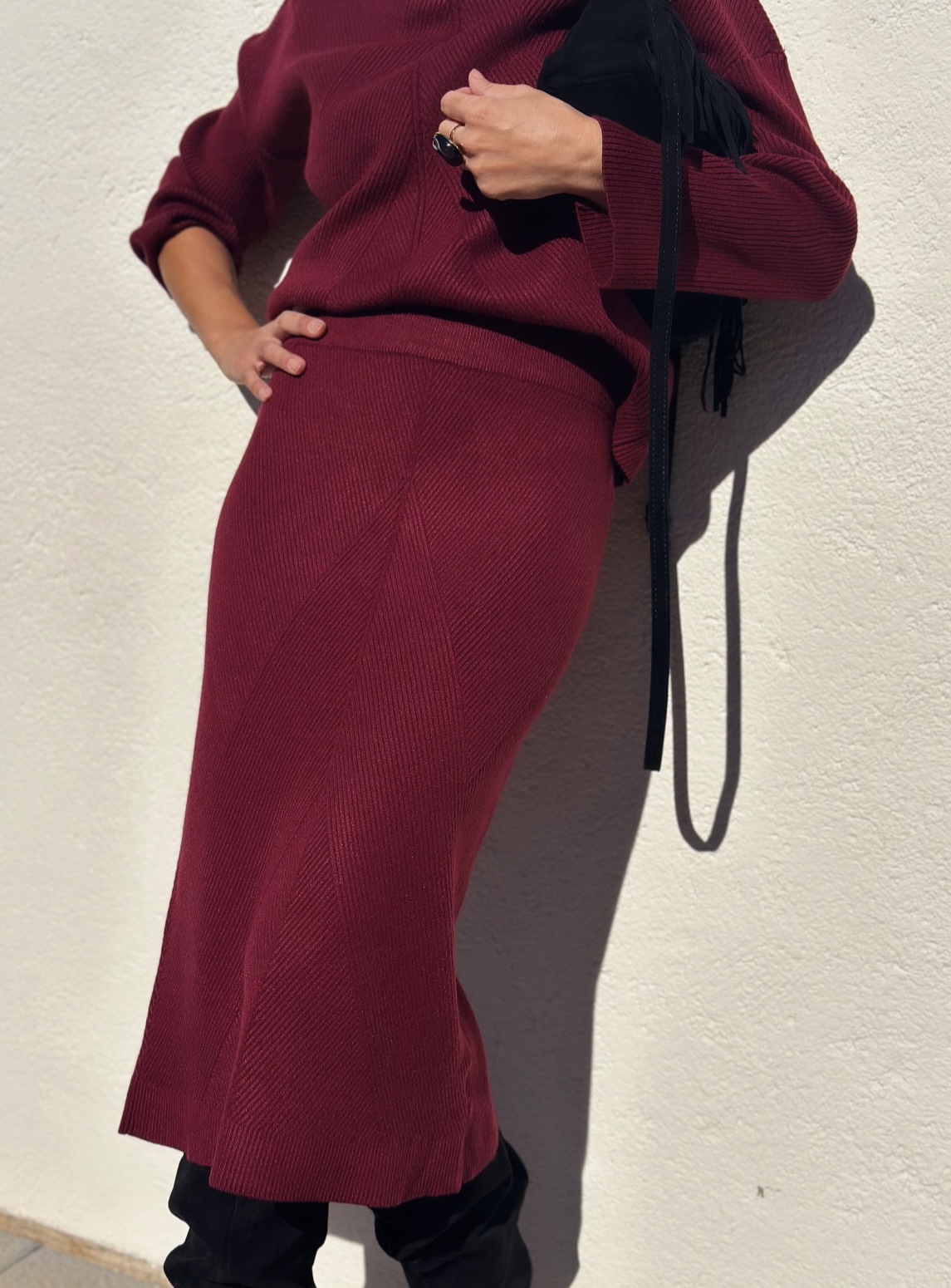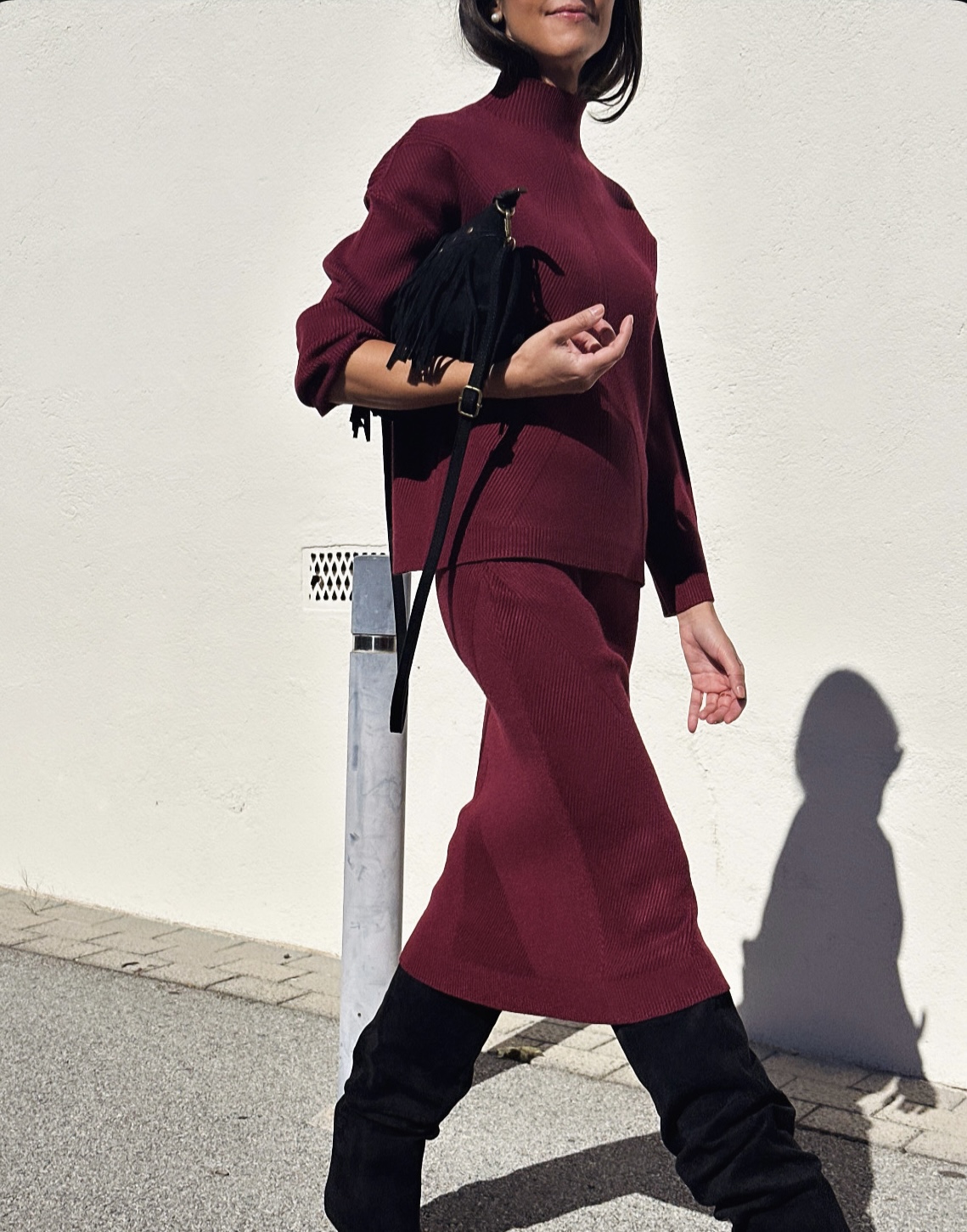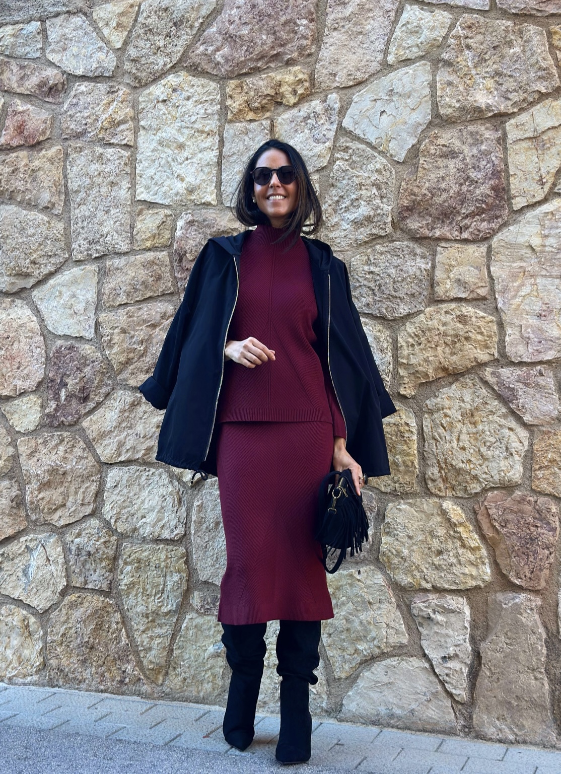 Conjunto de punto compuesto por una falda midi y un jersey de cuello perkins. Falda tipo lápiz con elástico en la cintura y ajustable al cuerpo, y jersey de corte recto. Un total look muy llevable, que puedes lucir más casual o más elegante en función de los complementos. Añádele un poncho para realzar el outfit.