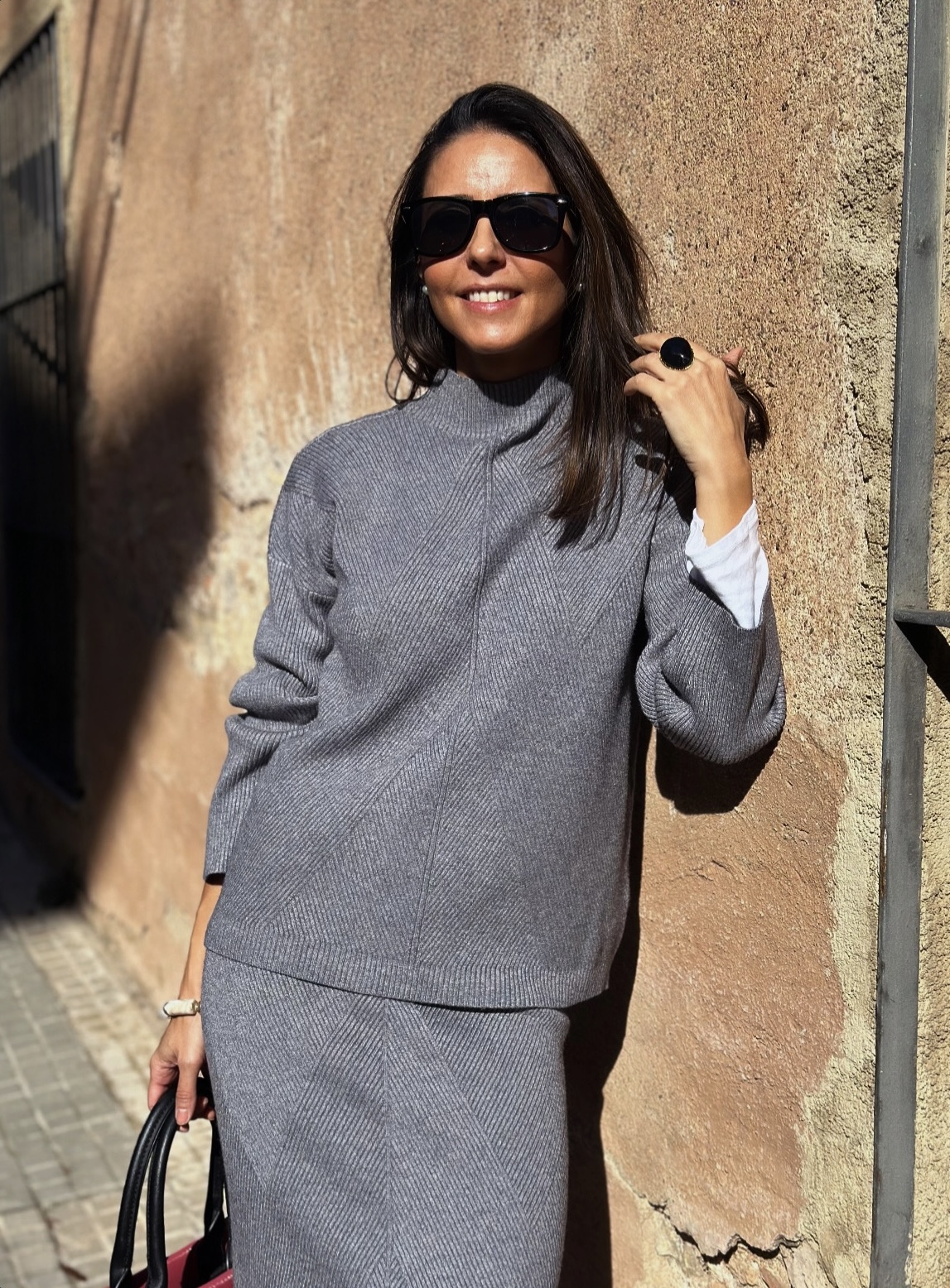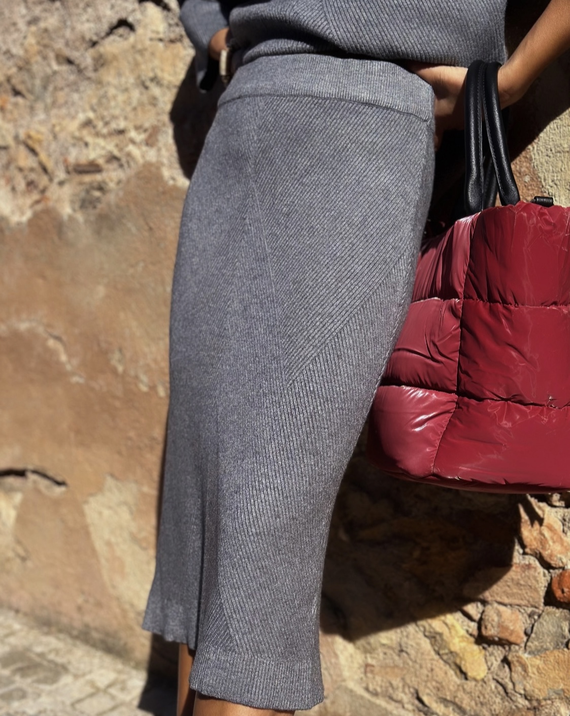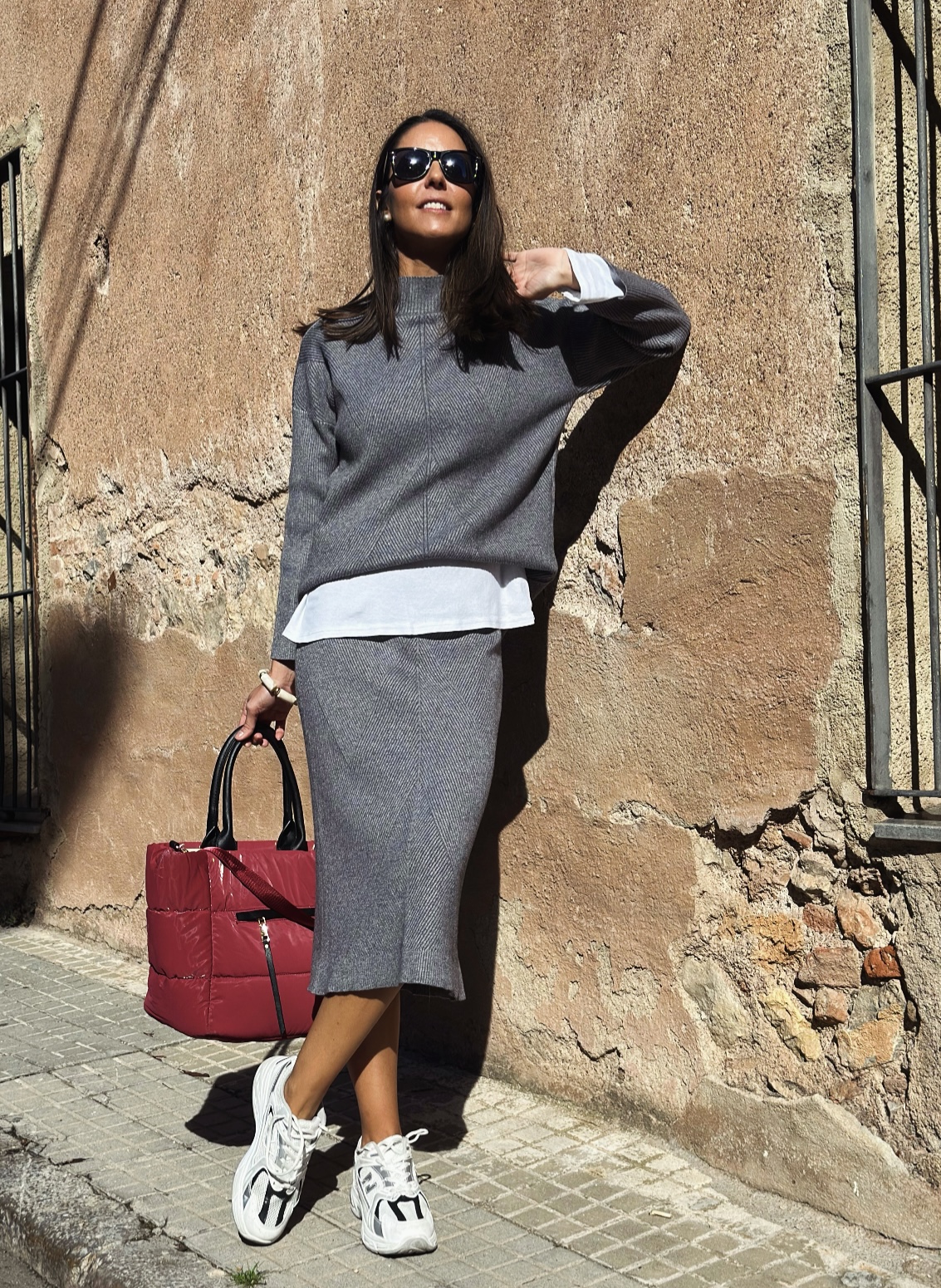 Conjunto de punto compuesto por una falda midi y un jersey de cuello perkins. Falda tipo lápiz con elástico en la cintura y ajustable al cuerpo, y jersey de corte recto. Un total look muy llevable, que puedes lucir más casual o más elegante en función de los complementos. Añádele un poncho para realzar el outfit.