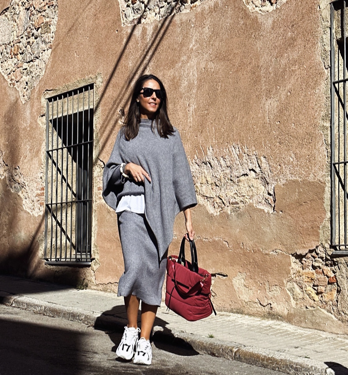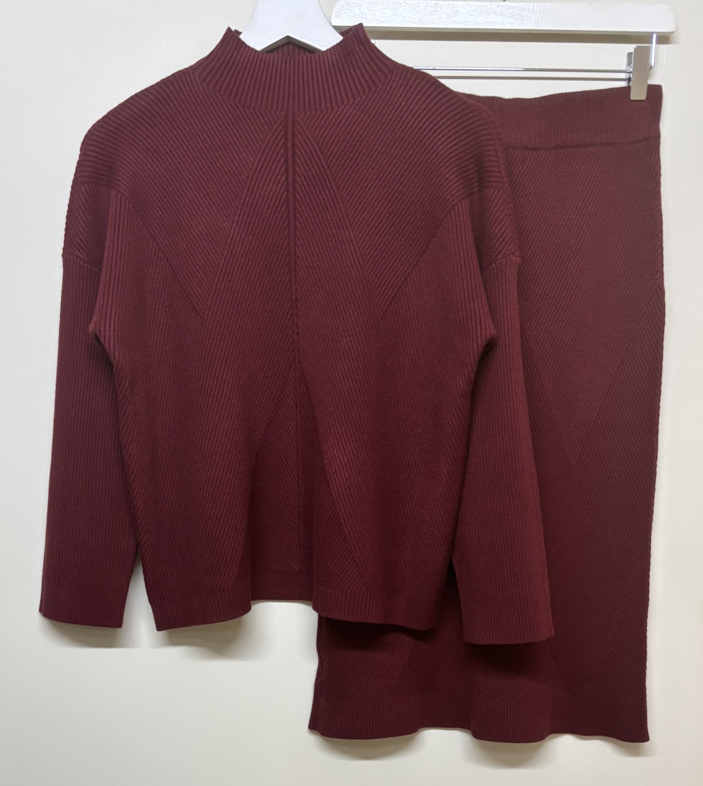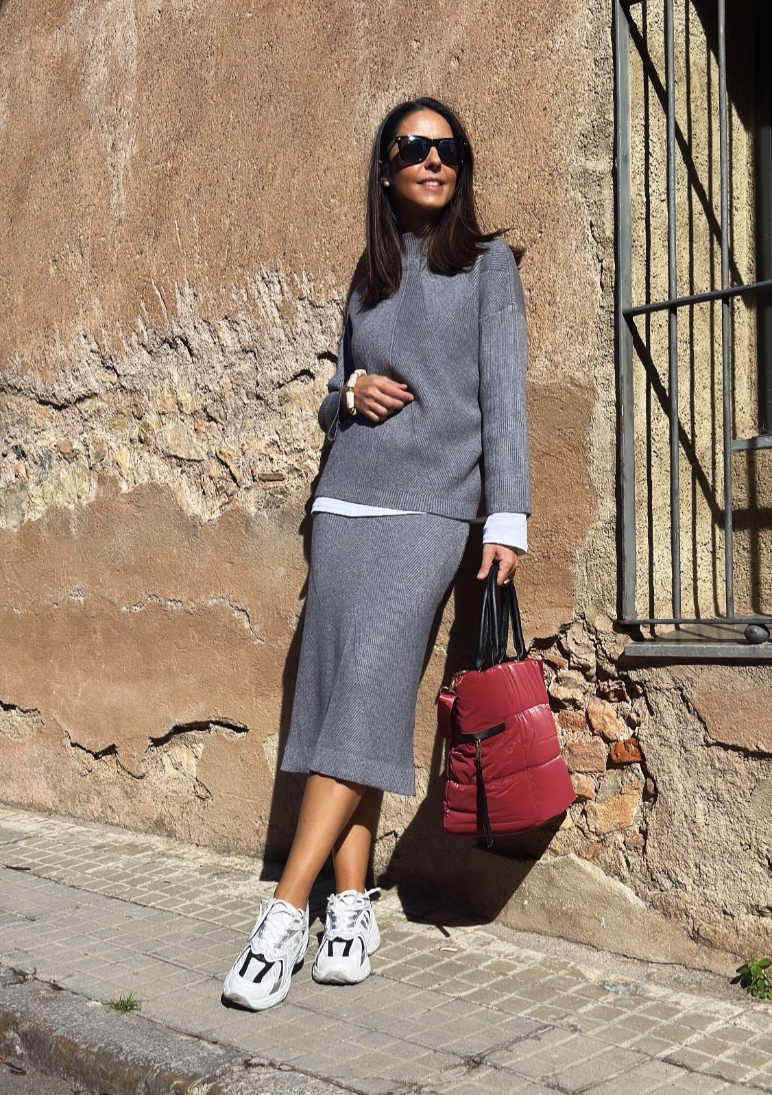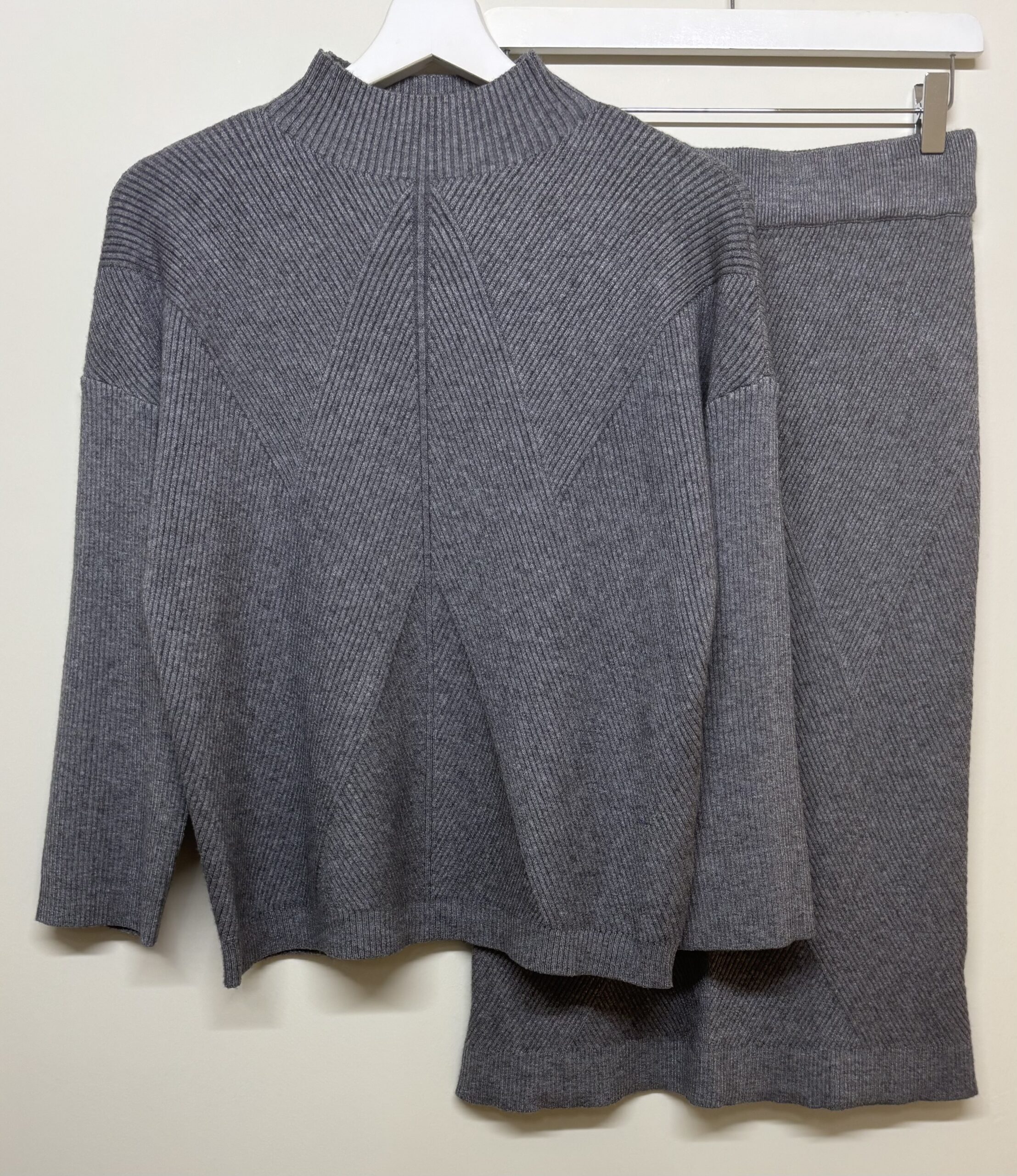 Conjunto de punto compuesto por una falda midi y un jersey de cuello perkins. Falda tipo lápiz con elástico en la cintura y ajustable al cuerpo, y jersey de corte recto. Un total look muy llevable, que puedes lucir más casual o más elegante en función de los complementos. Añádele un poncho para realzar el outfit.
