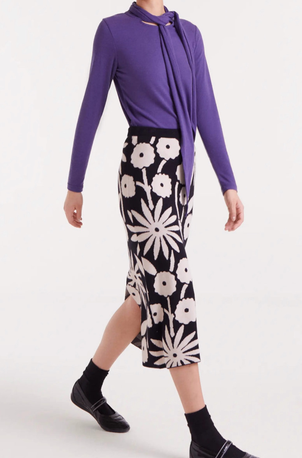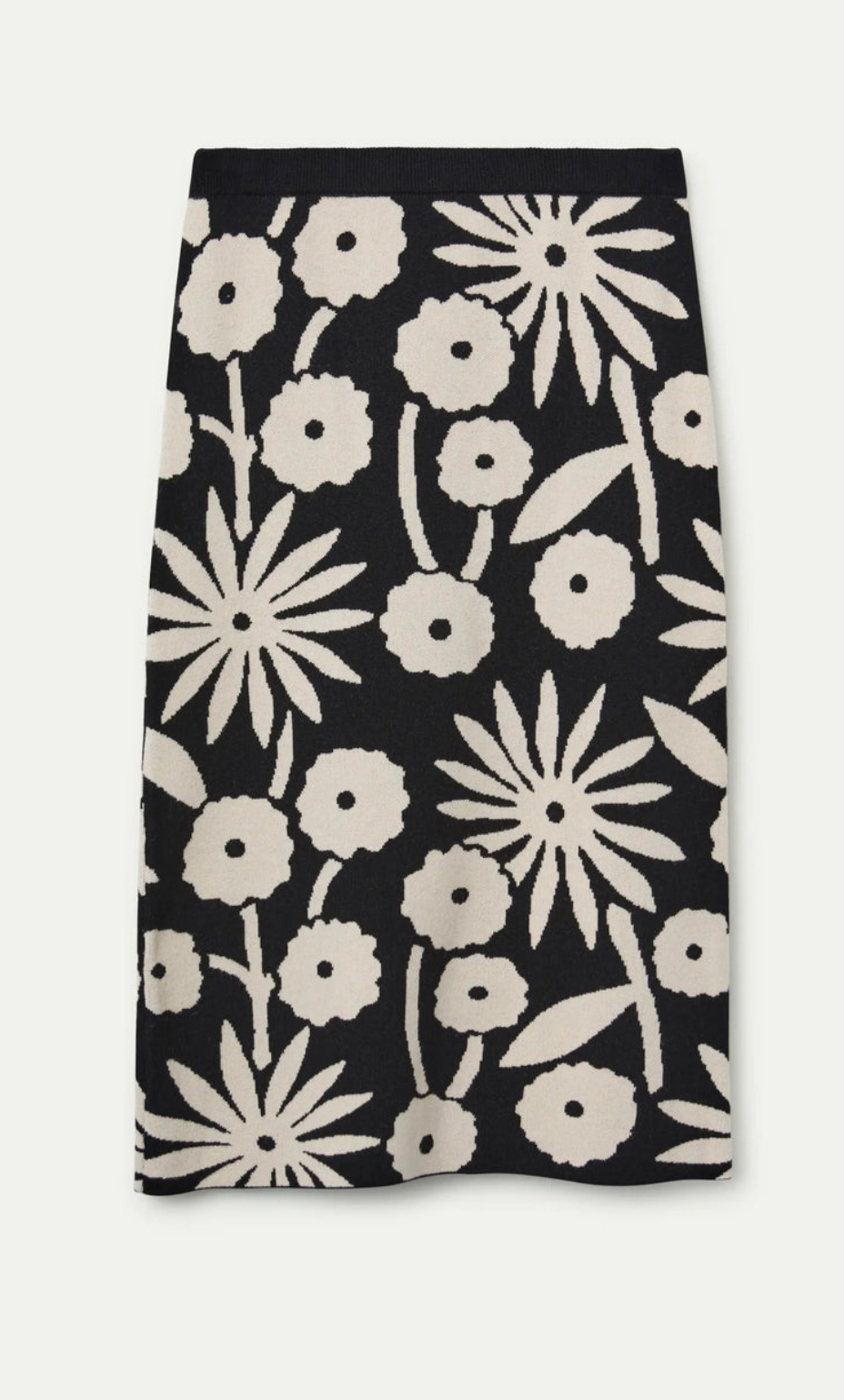 Falda midi jacquard en estampado Tofu. Con cintura elástica y ligera abertura en la parte trasera. Tejido de punto adaptable.