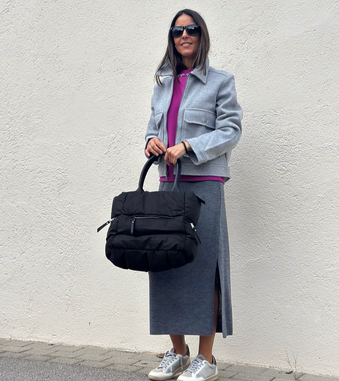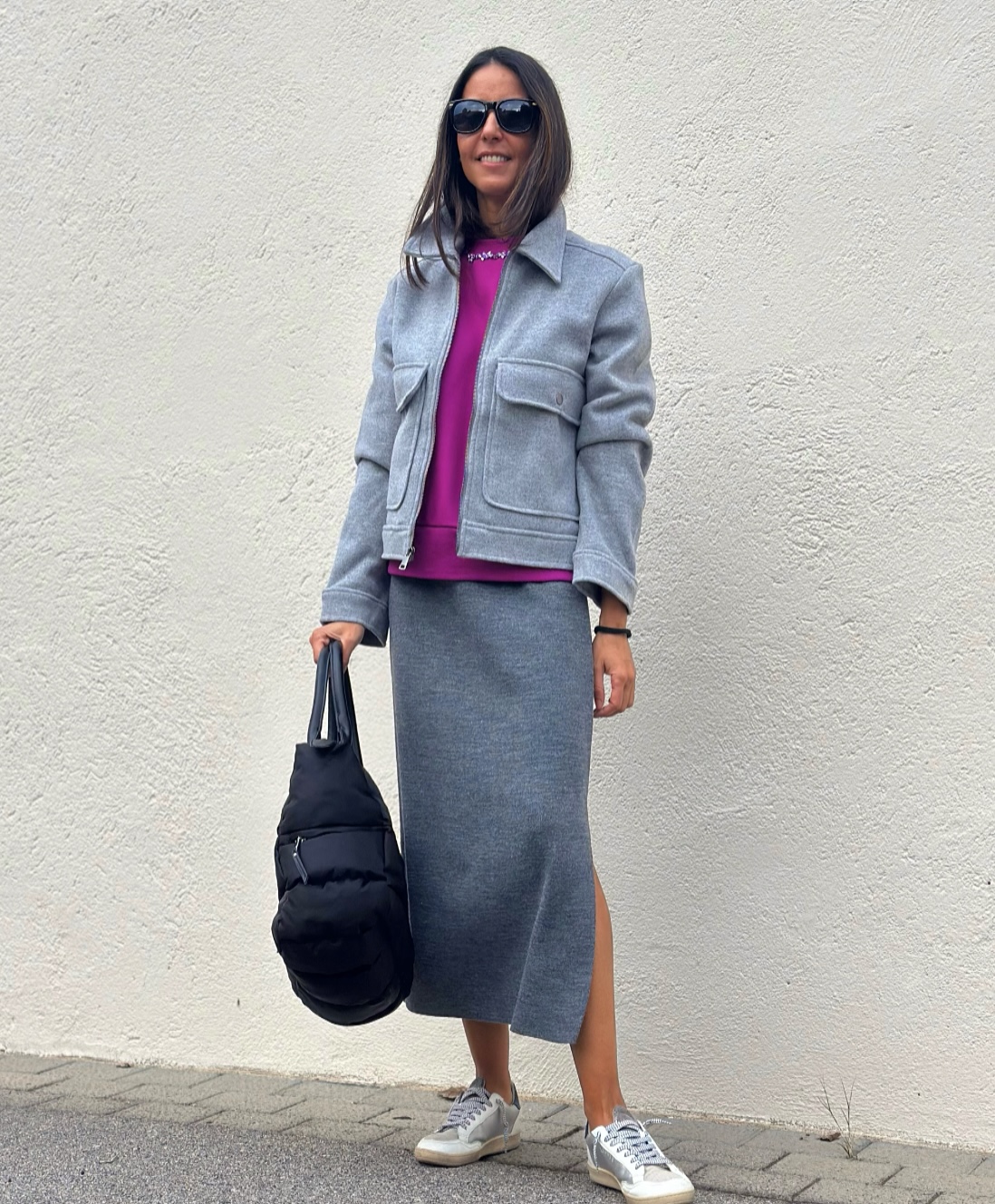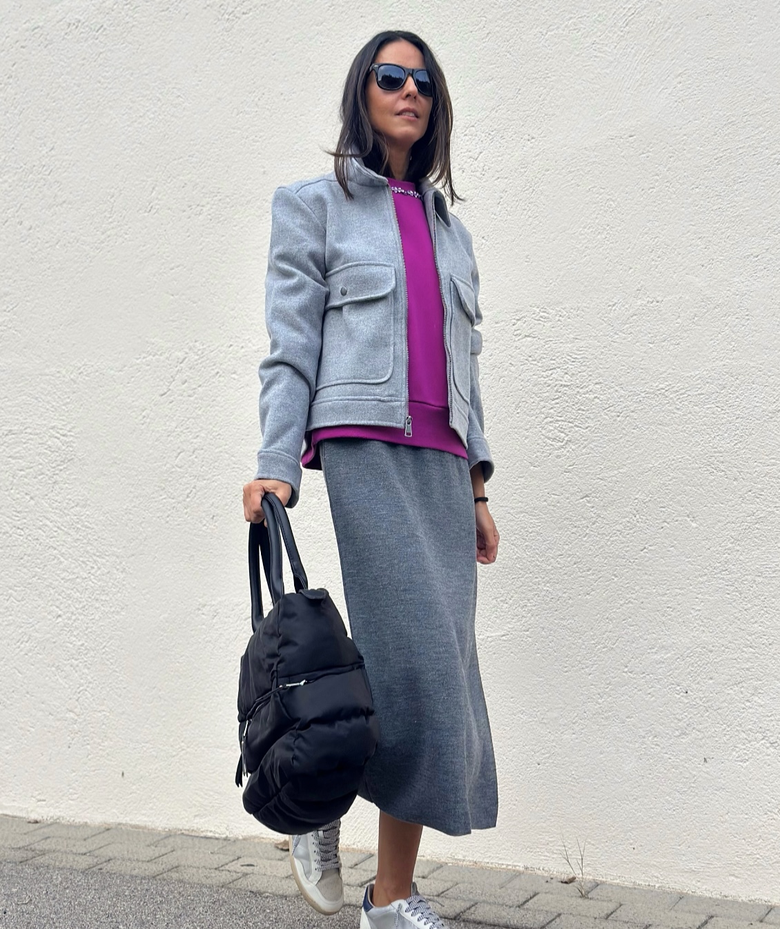 Falda básica de punto muy cómoda y fácil de combinar. Corte recto, elástico en cintura y abertura lateral en el bajo para caminar mejor. Muy versátil.