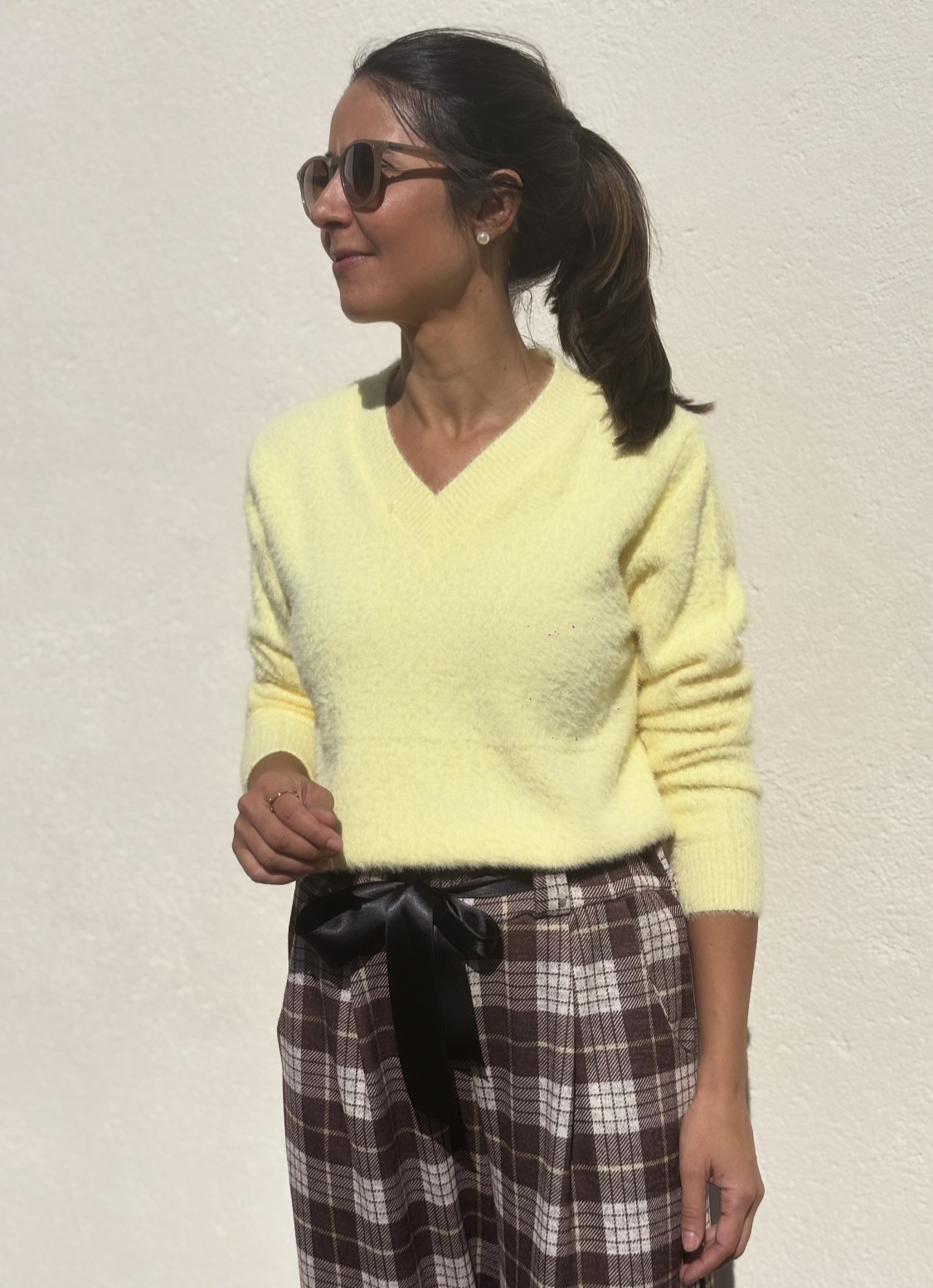 Jersey de un tejido extra suave tipo peluche, en cuello pico y corte recto. De un color amarillo precioso, que elevará tus looks.