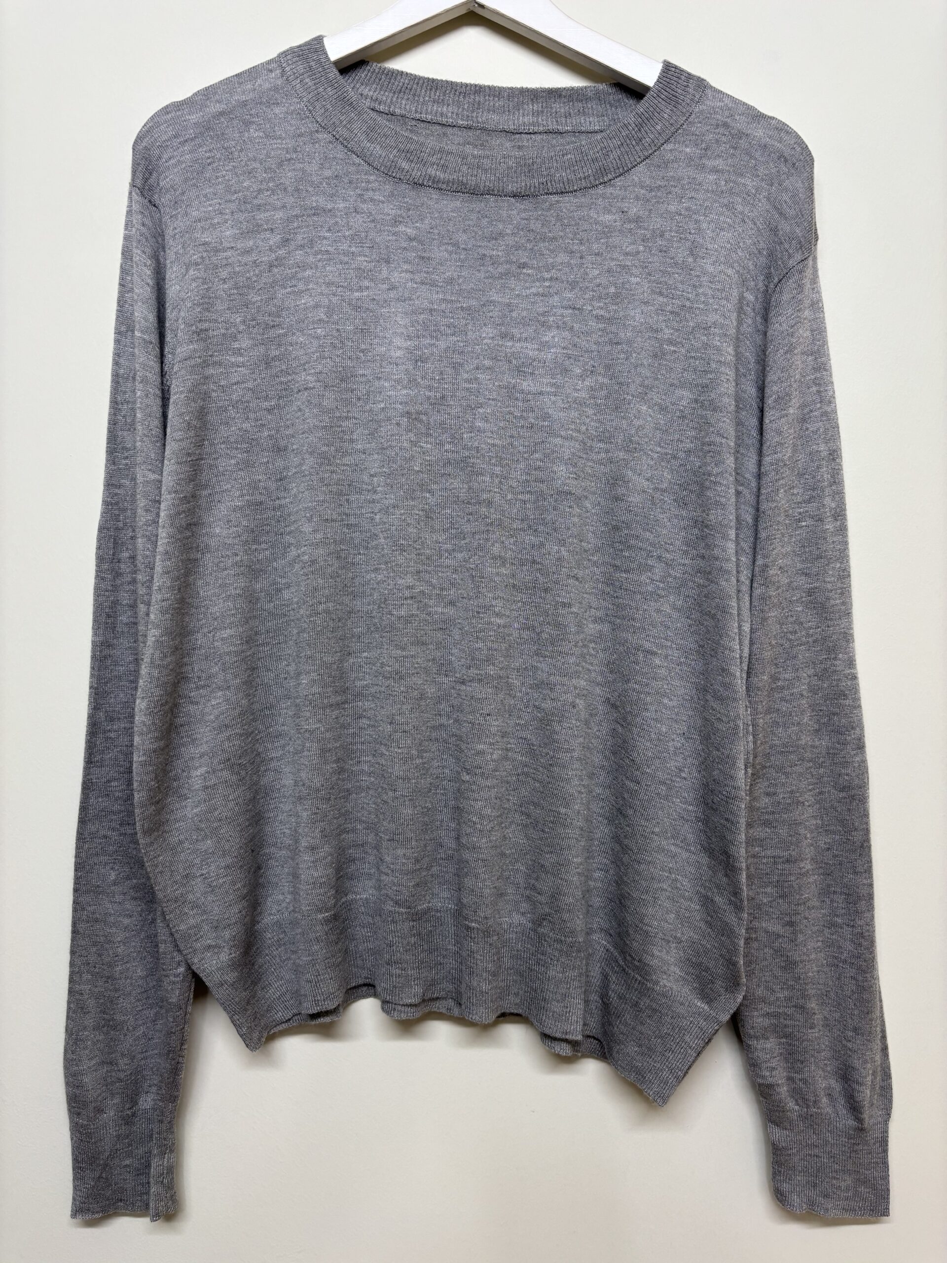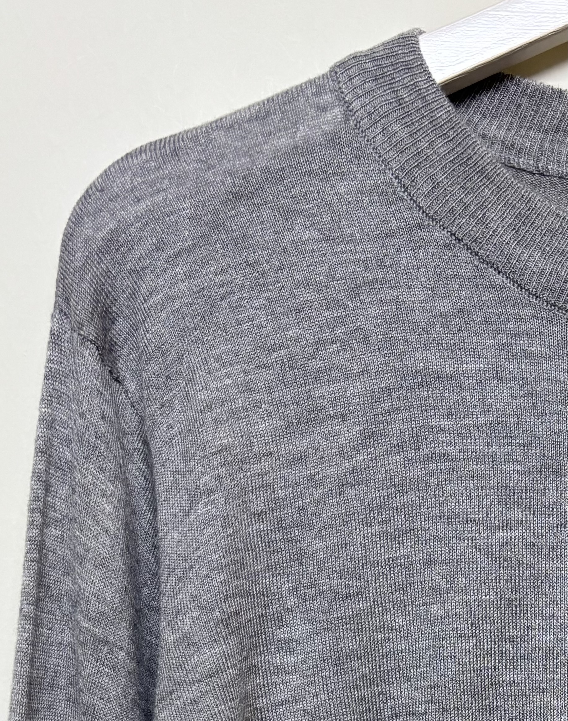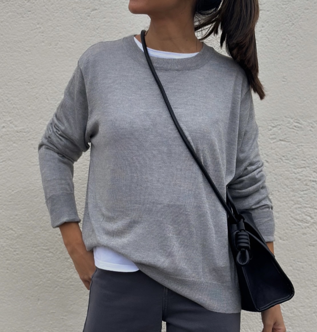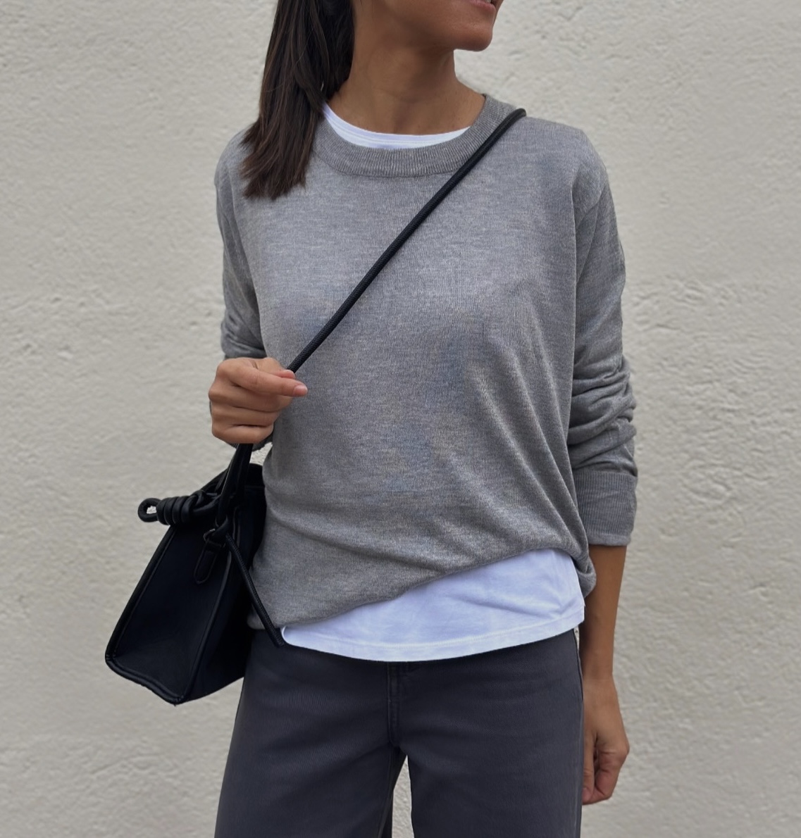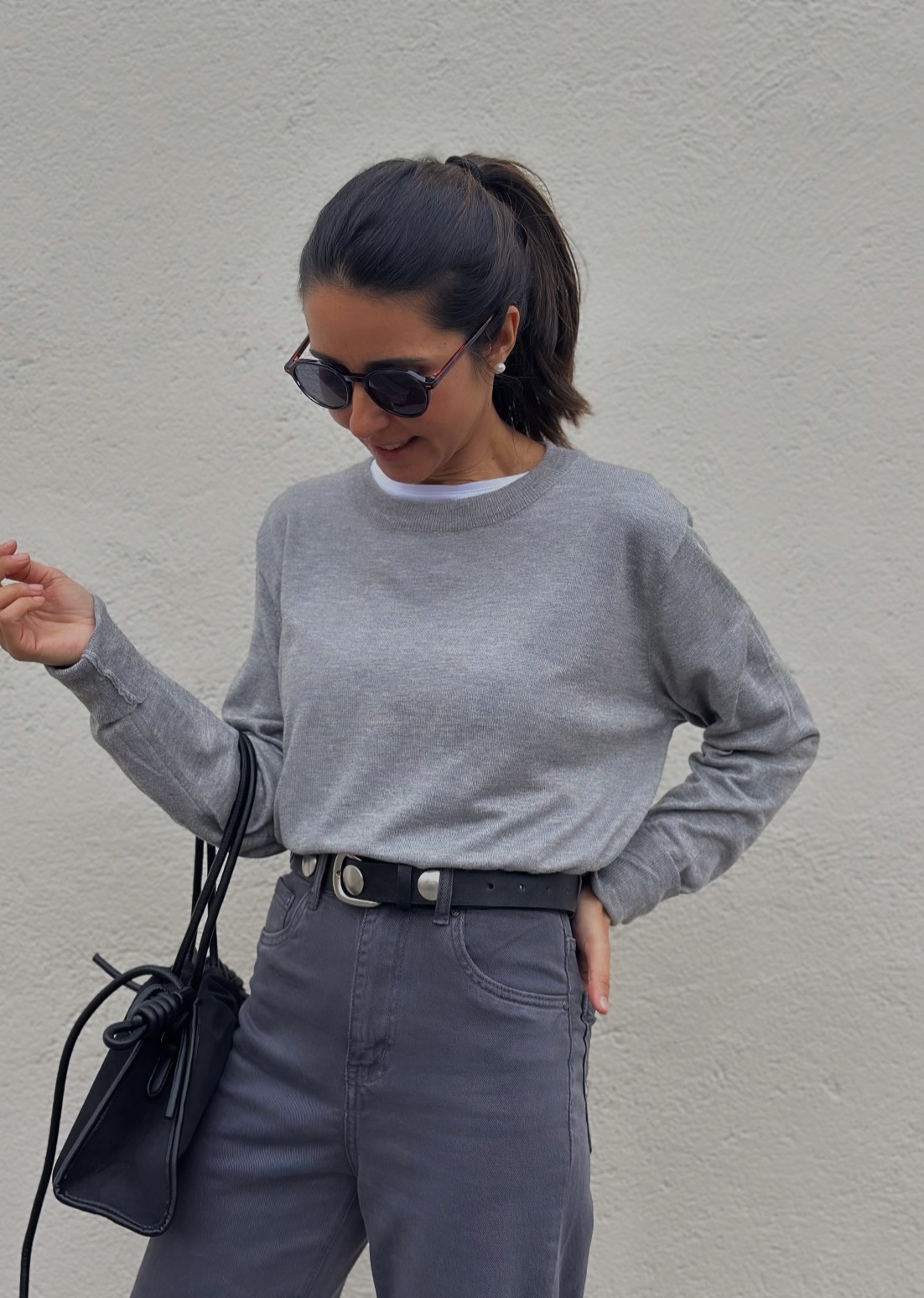 Jersey básico de cuello redondo en tejido de cashmere perfecto para Invierno. Lo combinamos con nuestra camiseta blanca de cuello redondo para crear efecto capa superpuesta, muy en tendencia.