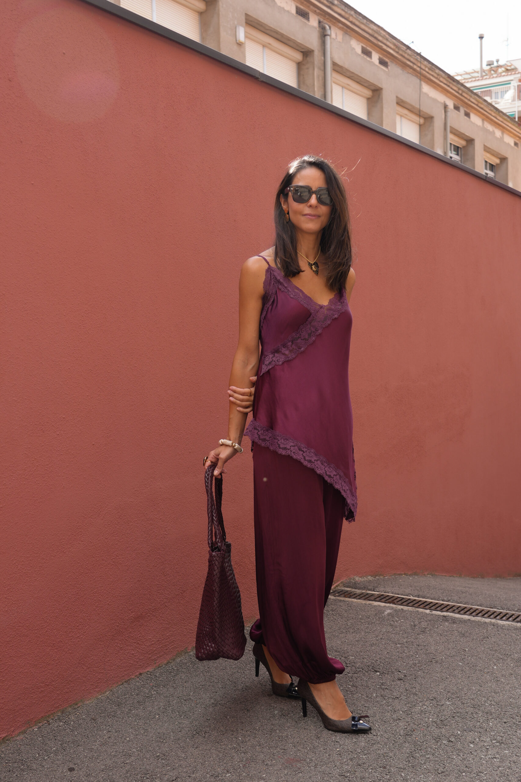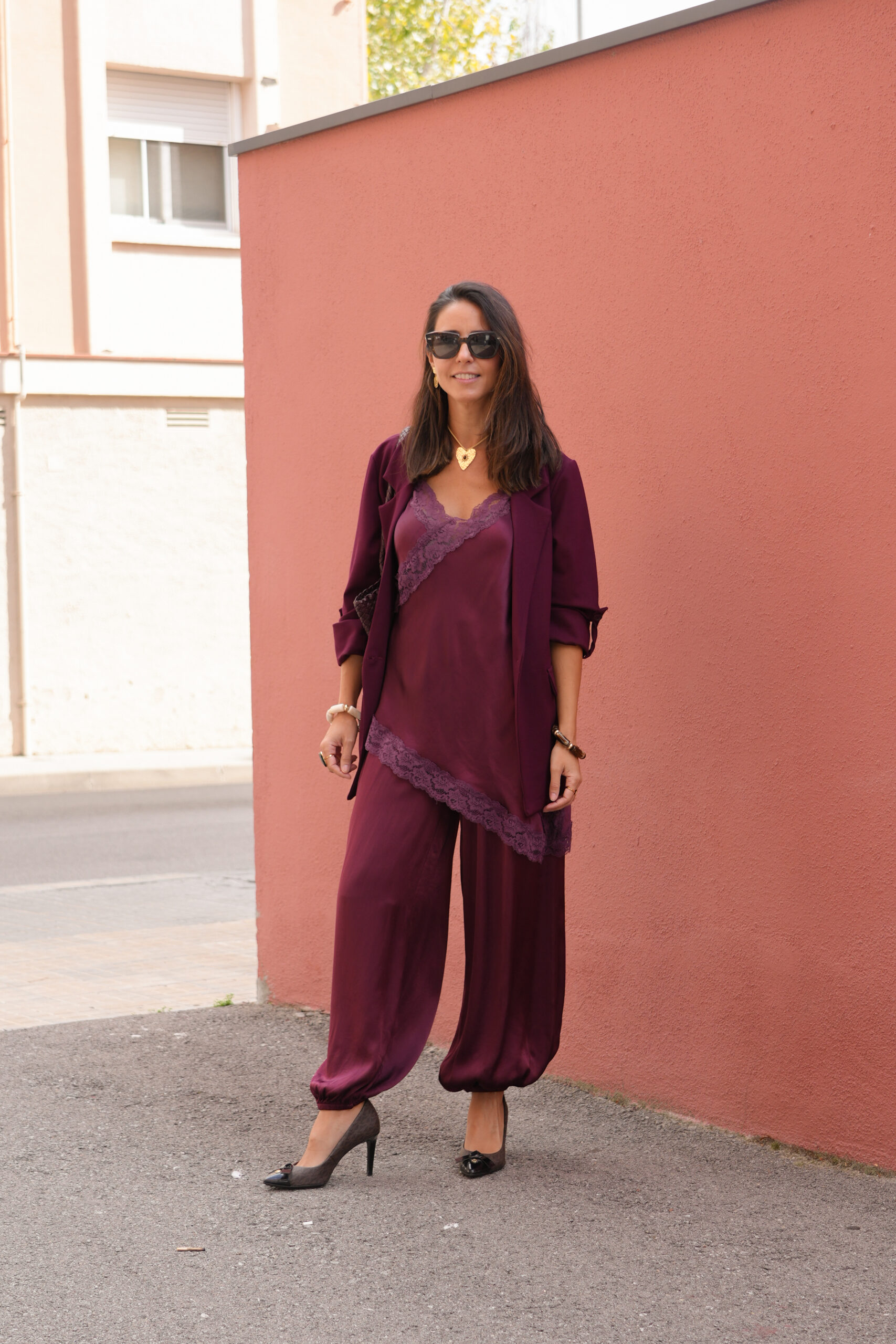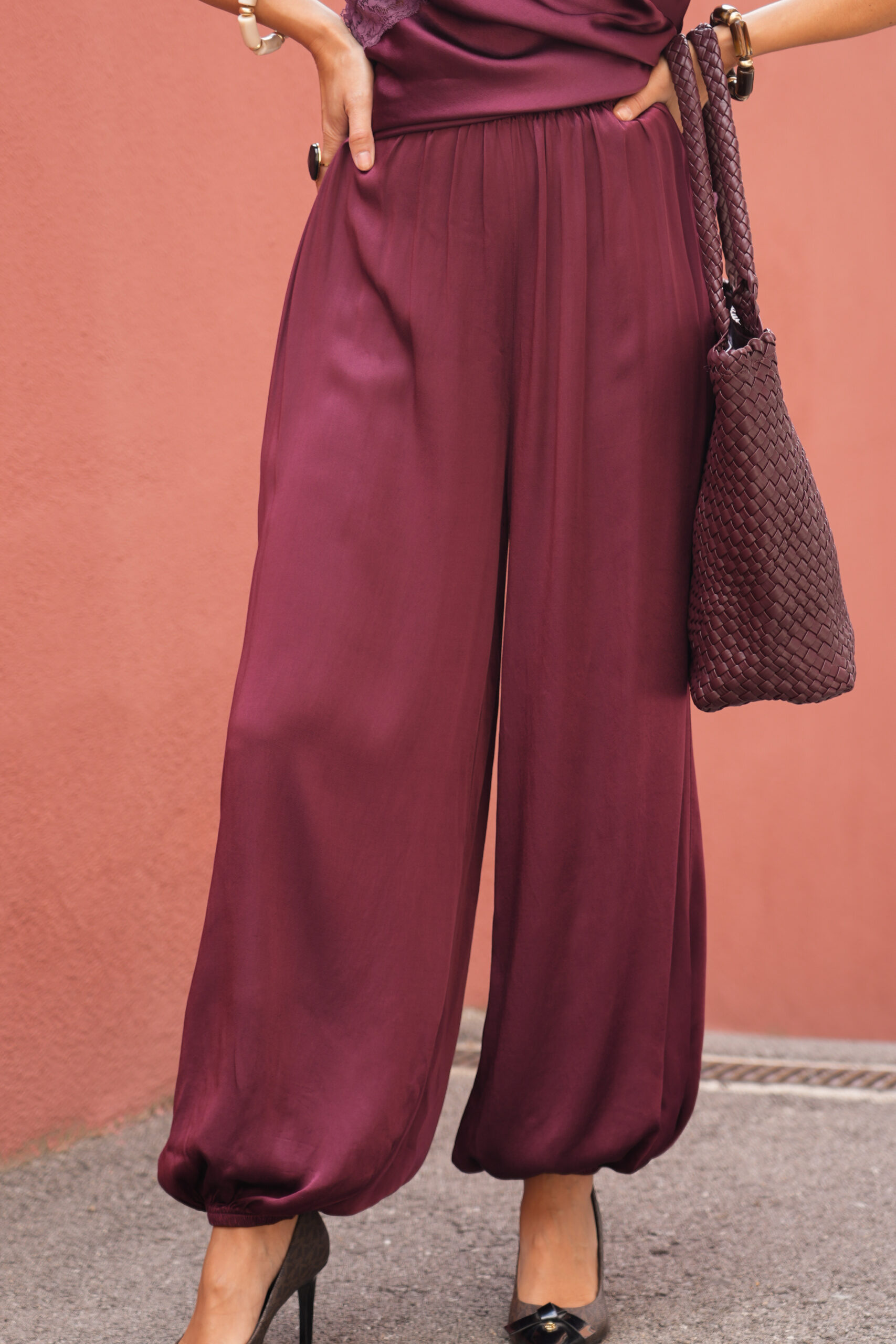 Pantalón satinado estilo bombacho con elástico en cintura y bajo. Combínalo con el Top Asimétrico del mismo tono para un total look muy actual.