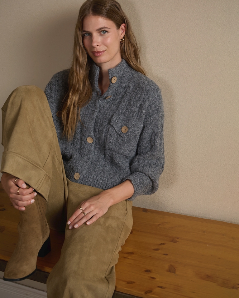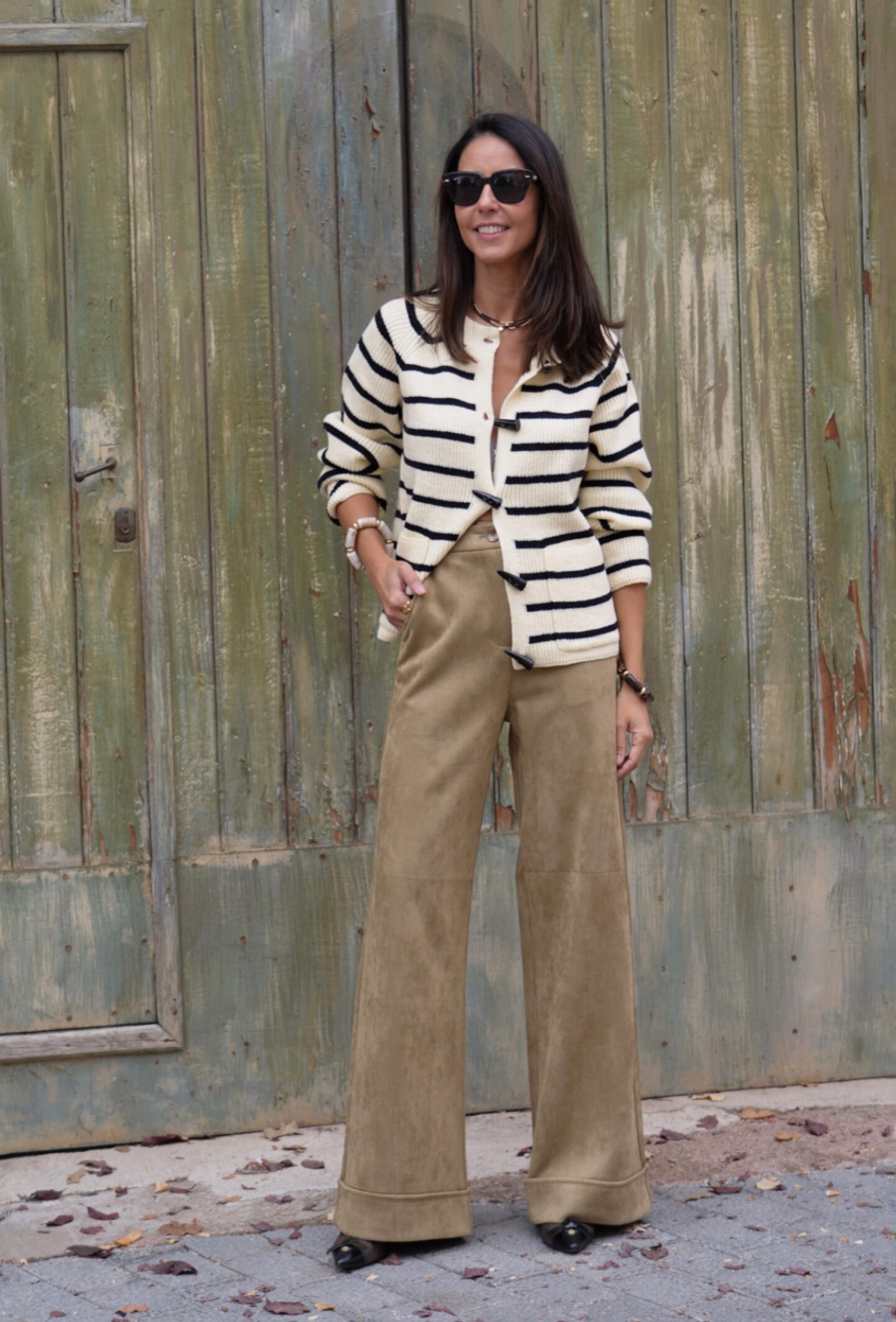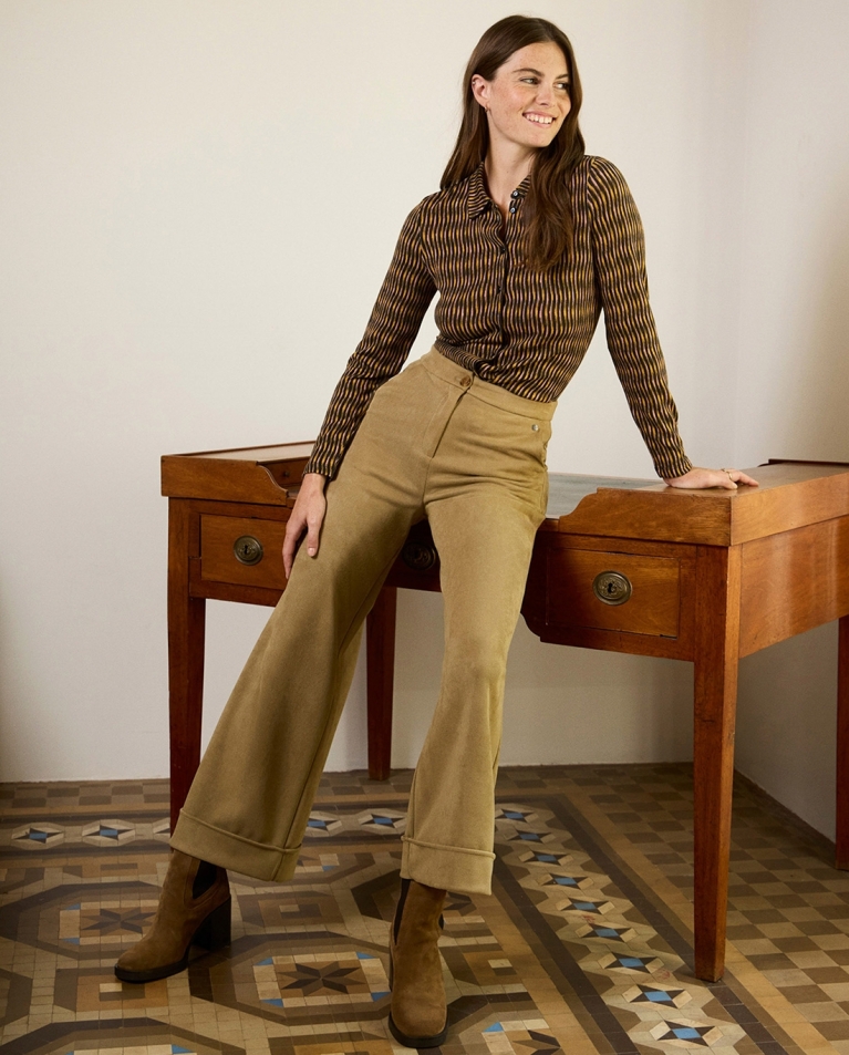 Pantalón negro de tejido aterciopelado, corte wide leg con bolsillos delanteros. Cierre con botón y cremallera. Elástico.