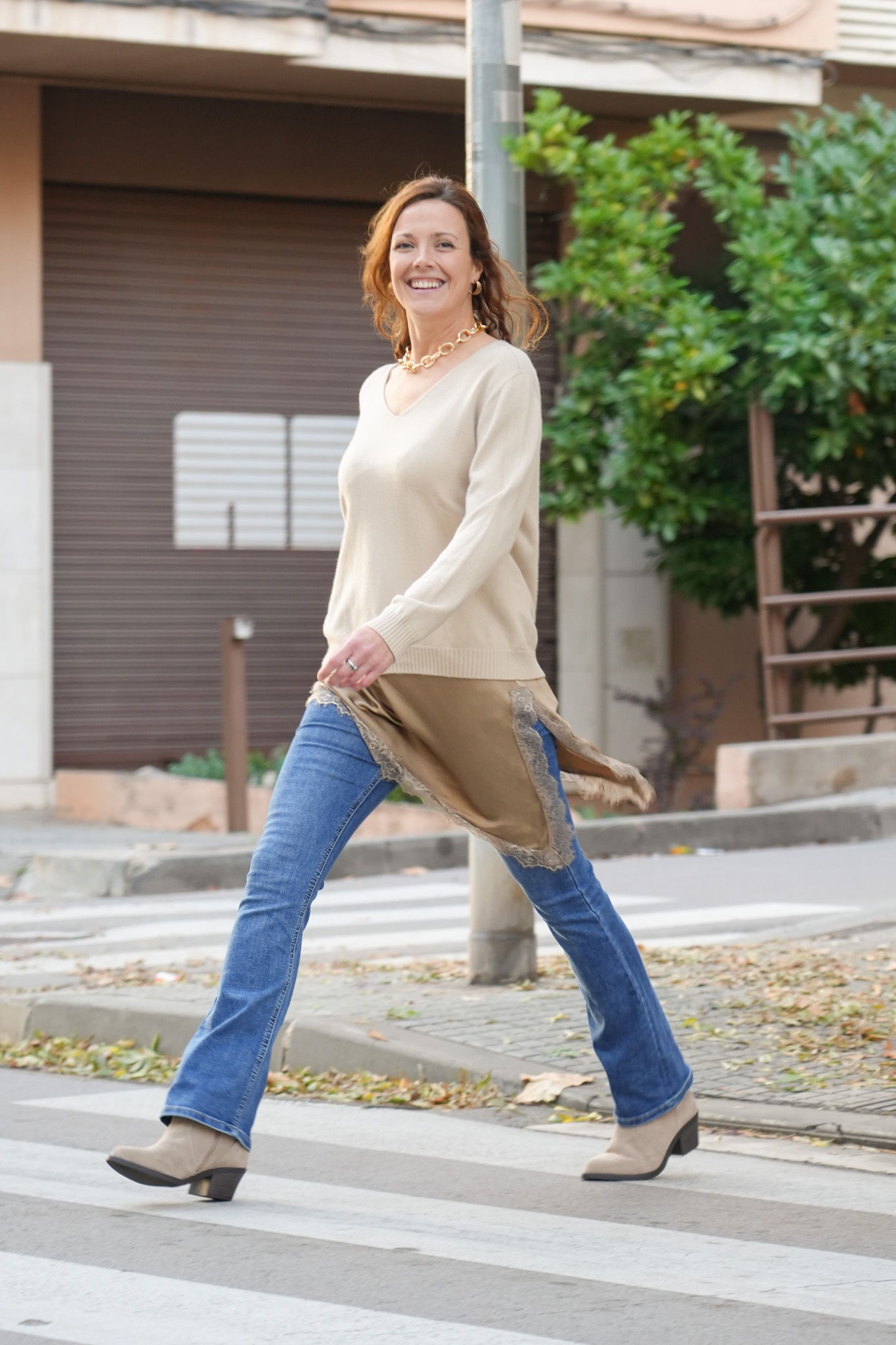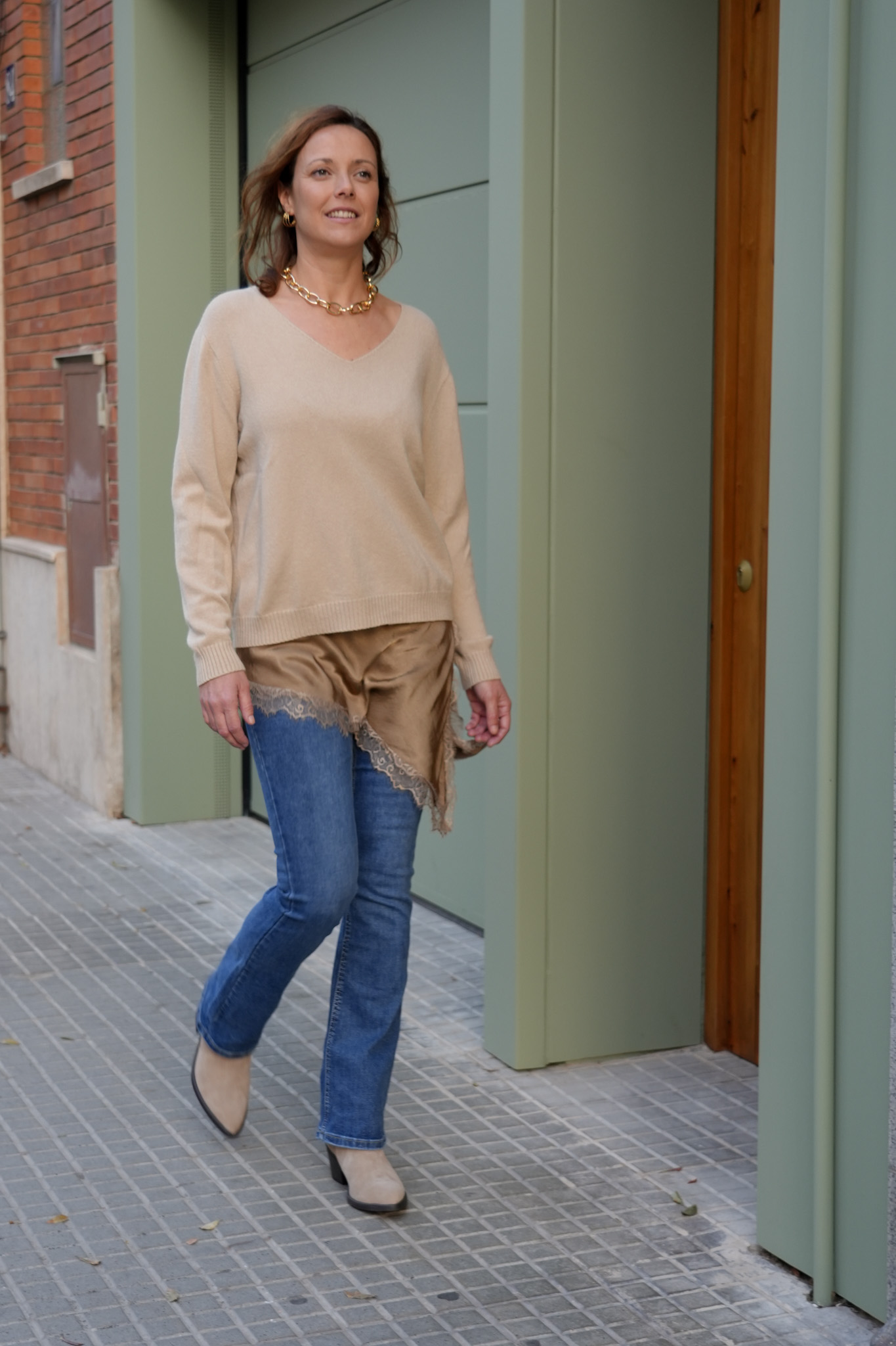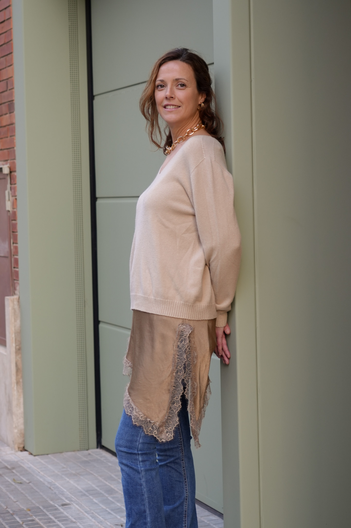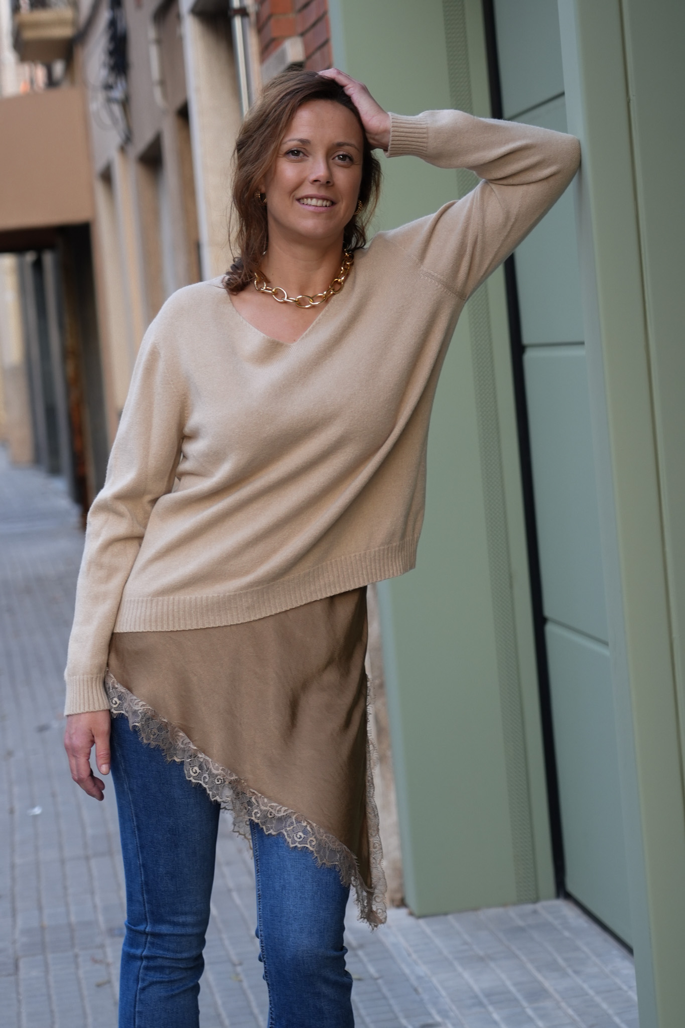 Top lencero satinado de puntilla con acabado asimétrico, un corte muy en tendencia esta temporada. Tirante regulable, cortado al bies para mayor adaptabilidad. Combínalo con el Pantalón Bombacho del mismo tono para un total look muy actual.
