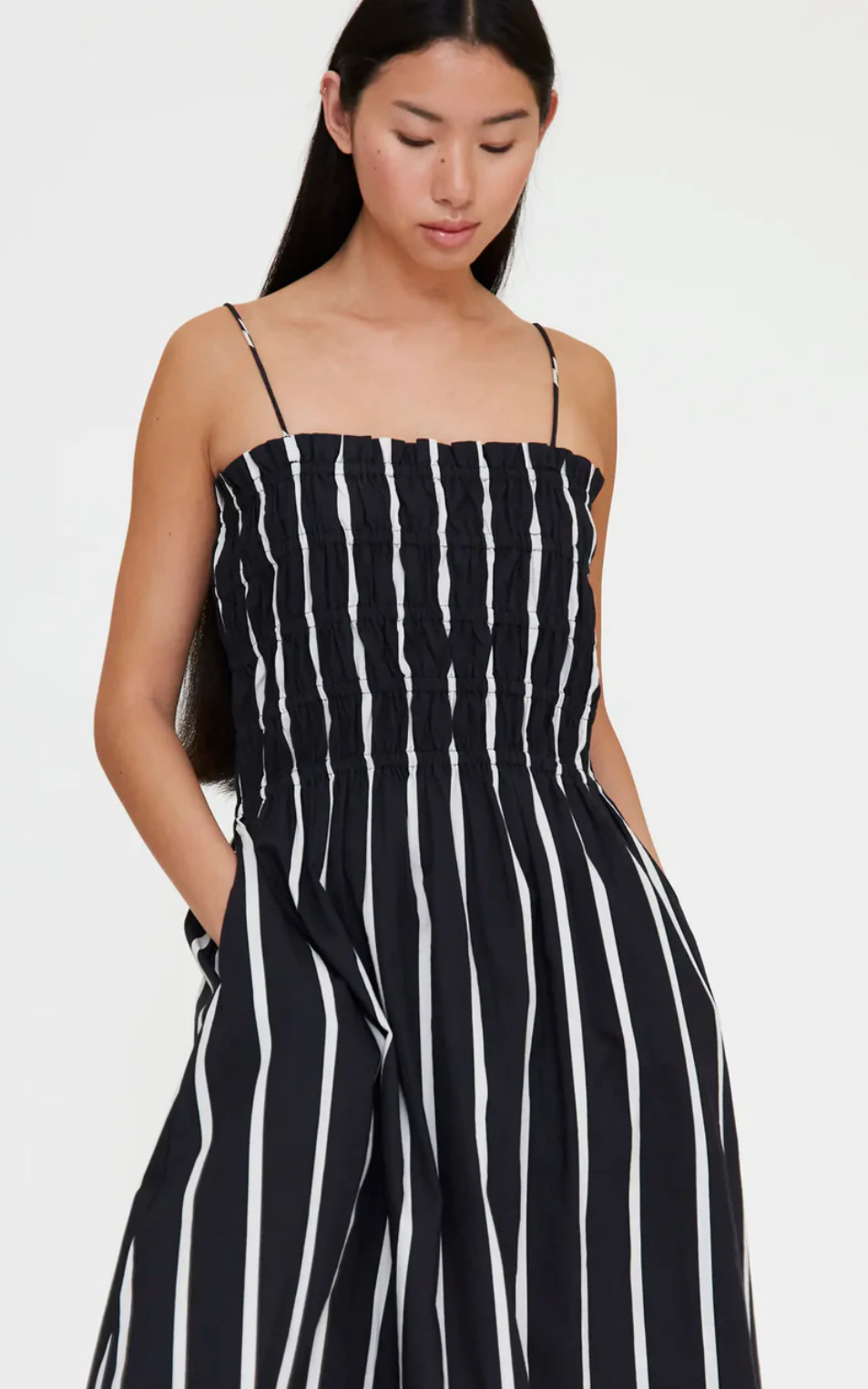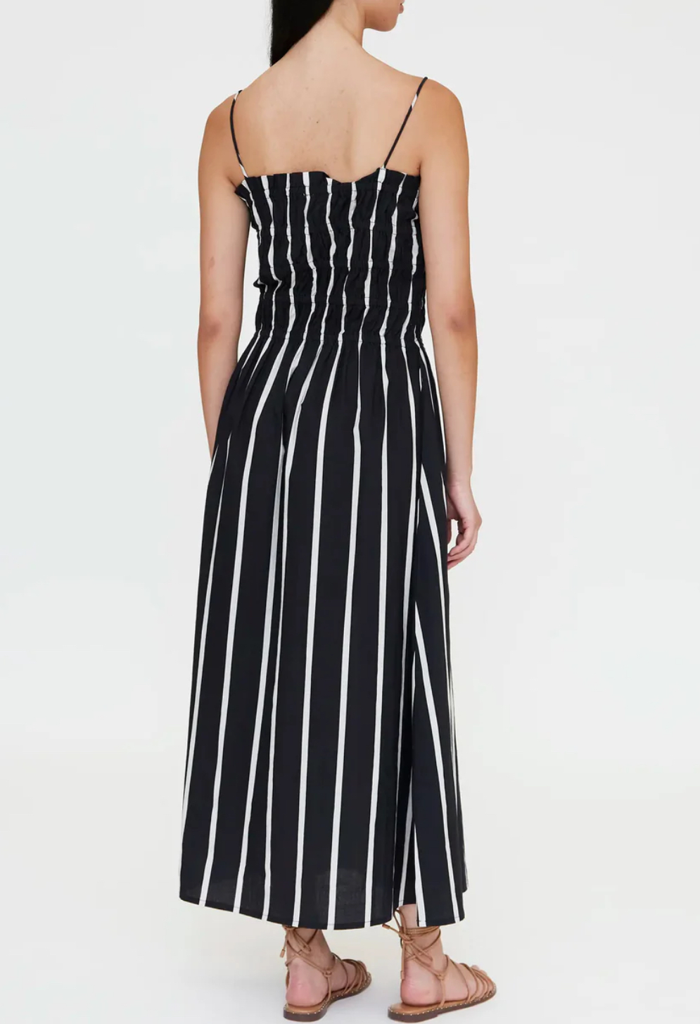Vestido largo de tejido 100% algodón en estampado Grimaud Black. Escote recto con tirantes finos. Detalles elásticos en pecho y falda fluida.