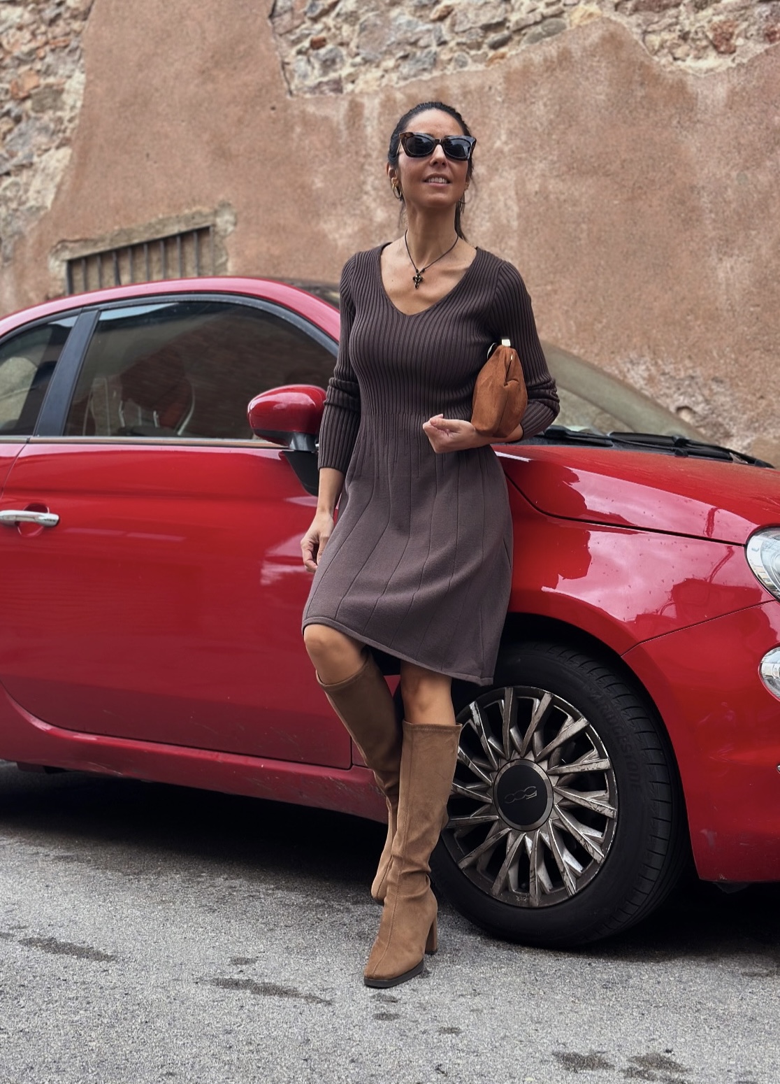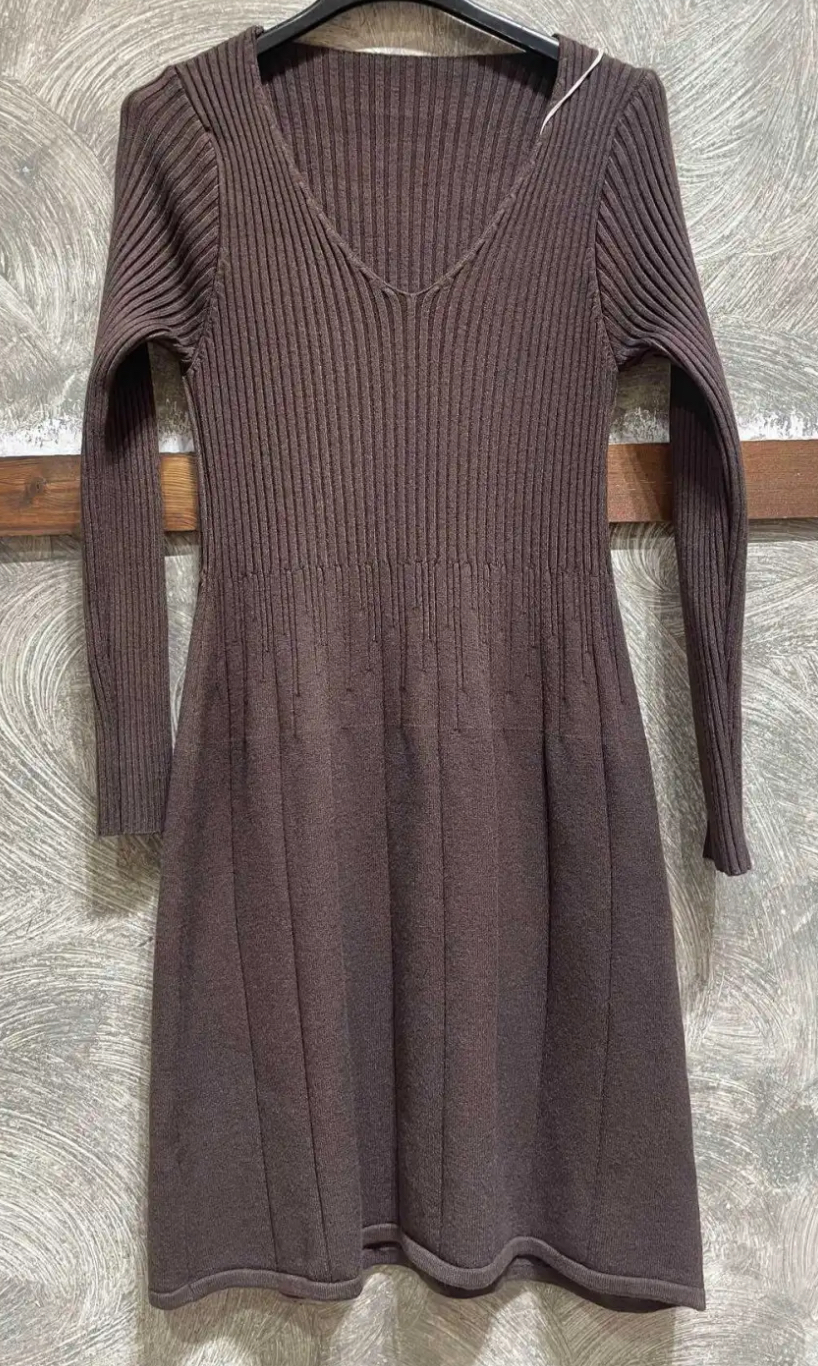Vestido de punto canalé, cuello pico y manga larga. Corte evasé. Un básico que no puede faltar en tu armario.